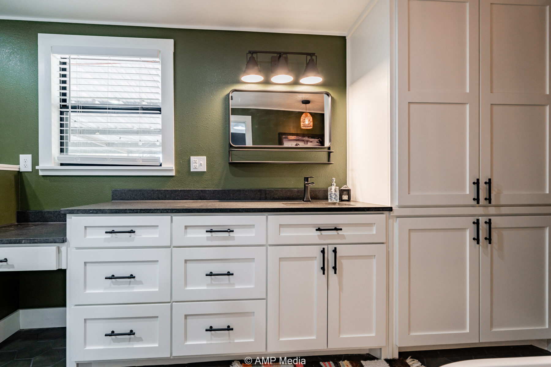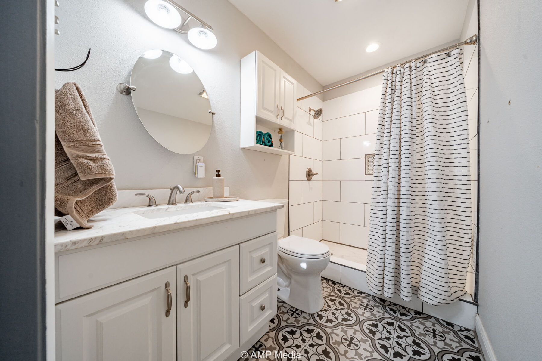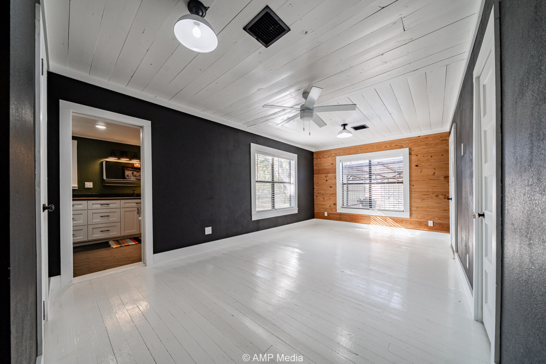 Inside, comfortable and inviting spaces are complemented by clean, contemporary lines and modern furnishings. The luxurious primary suite showcases original hardwood flooring, elegant gold fixtures, a spacious soaking tub, and a separate shower. The other master suite, located on the opposite end of the home, is beautifully updated with a walk-in shower featuring classic white subway tile.