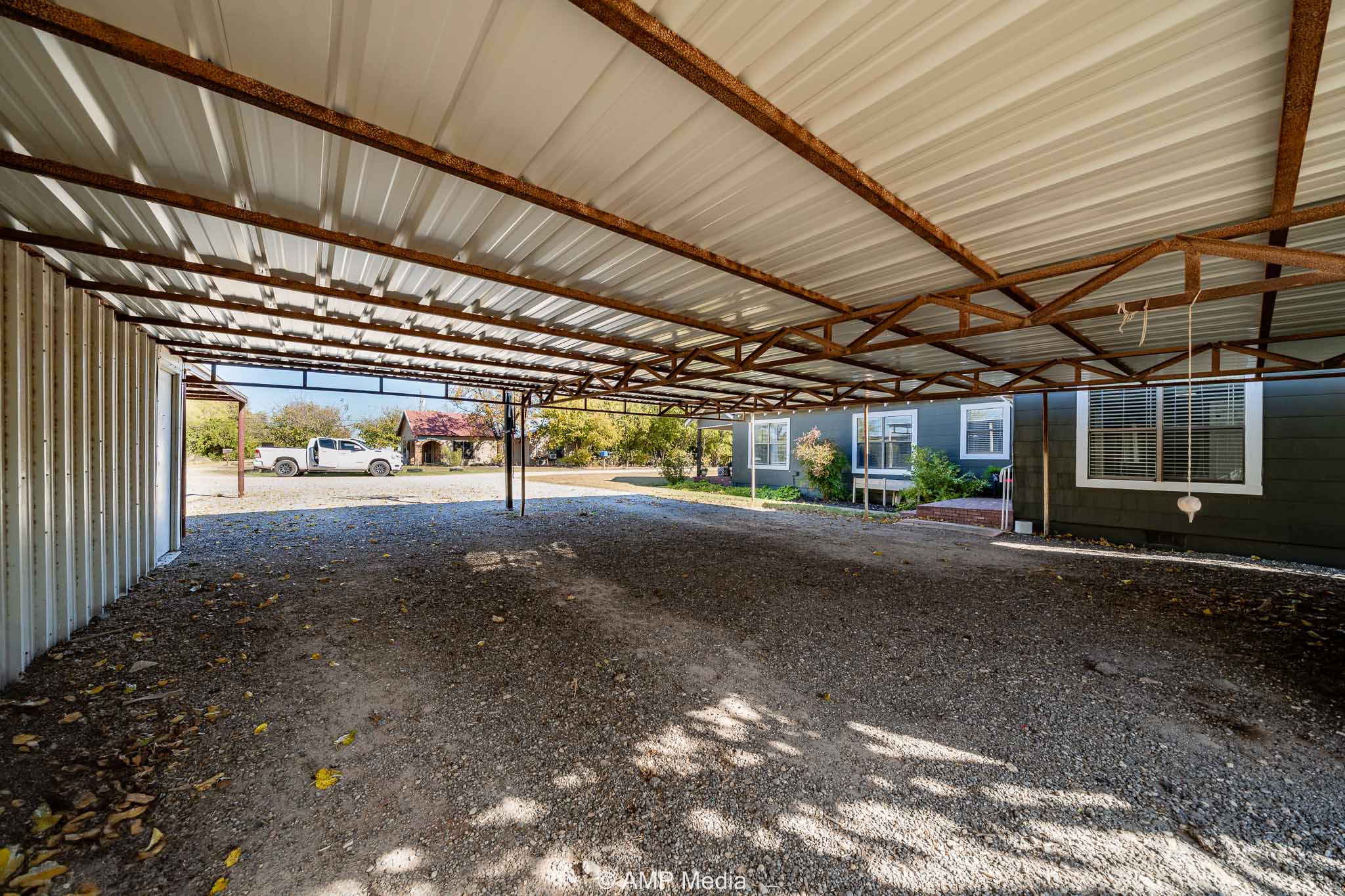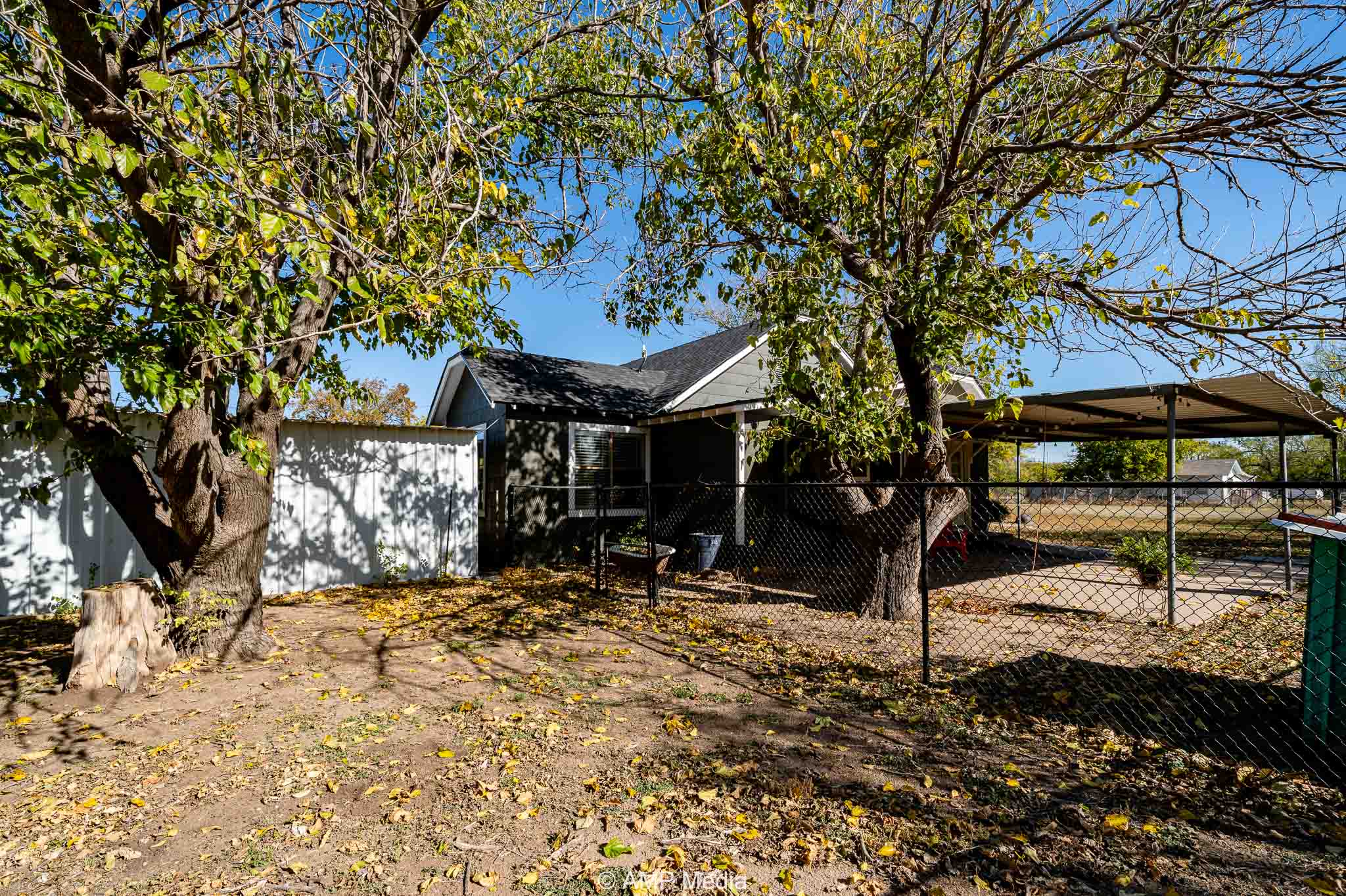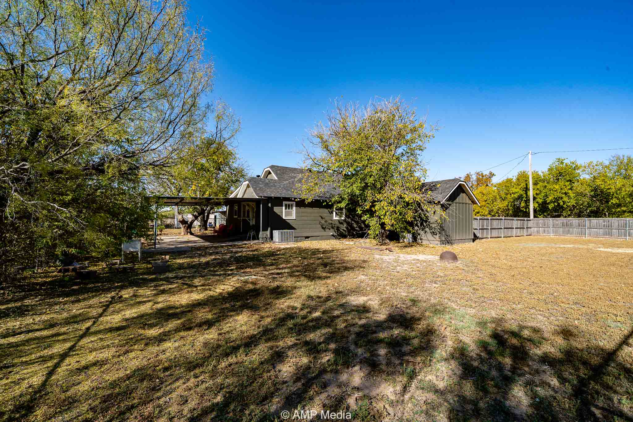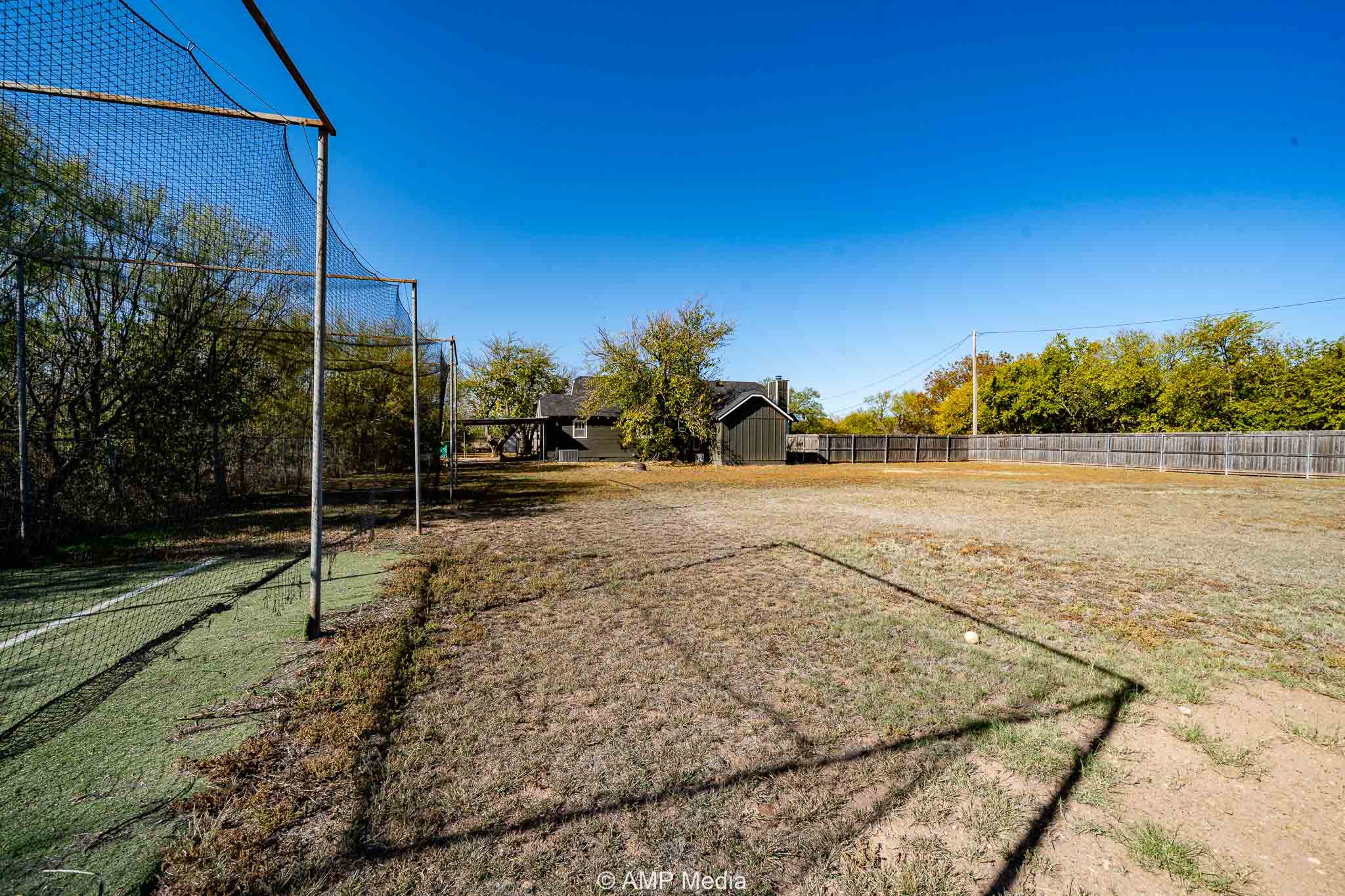 The oversized backyard provides ample space for family cookouts and entertaining, featuring a batting cage and a workshop equipped with electricity.