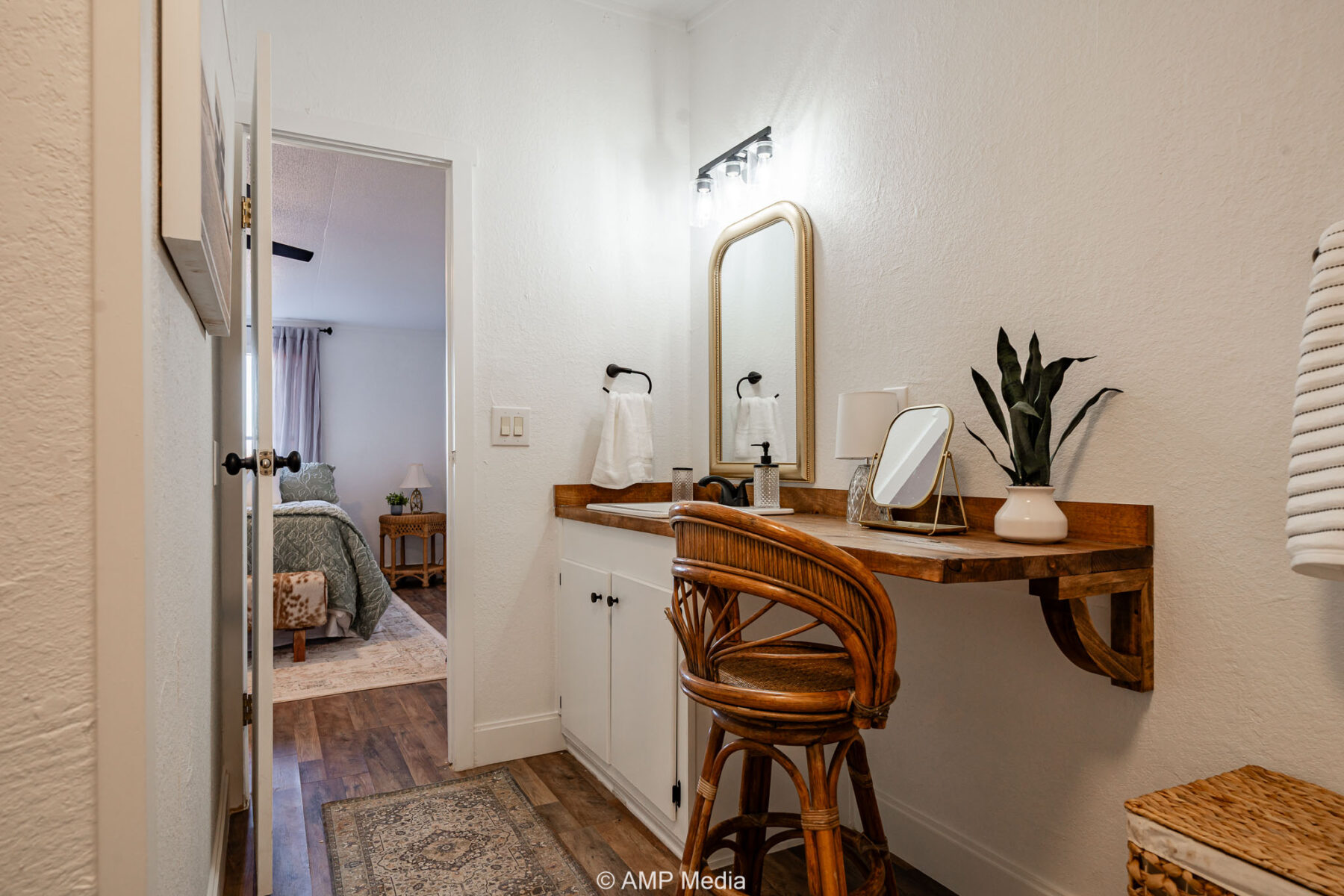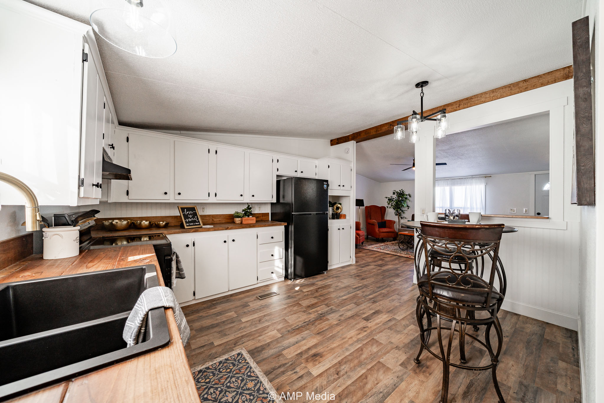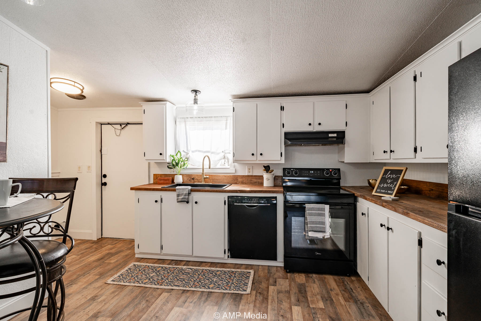 Inside, the home offers an open layout with new flooring throughout, a bright kitchen with butcher block countertops, and updated fixtures. The primary suite features a private vanity area, and both bathrooms have been tastefully remodeled.