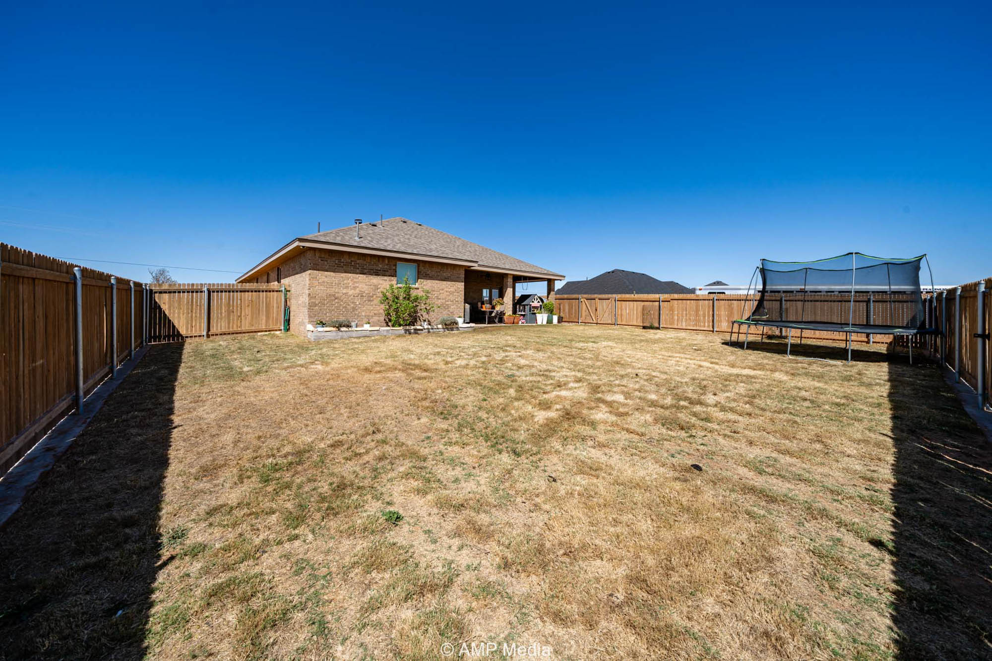 White vinyl fence surrounds property boundary. The backyard has a privacy fence in place.