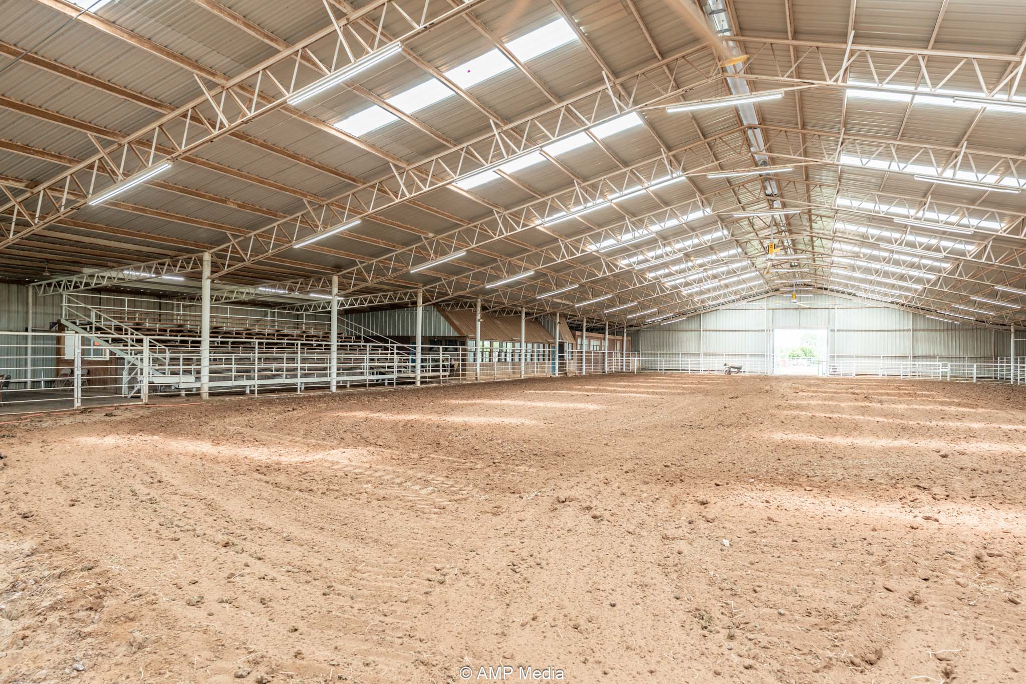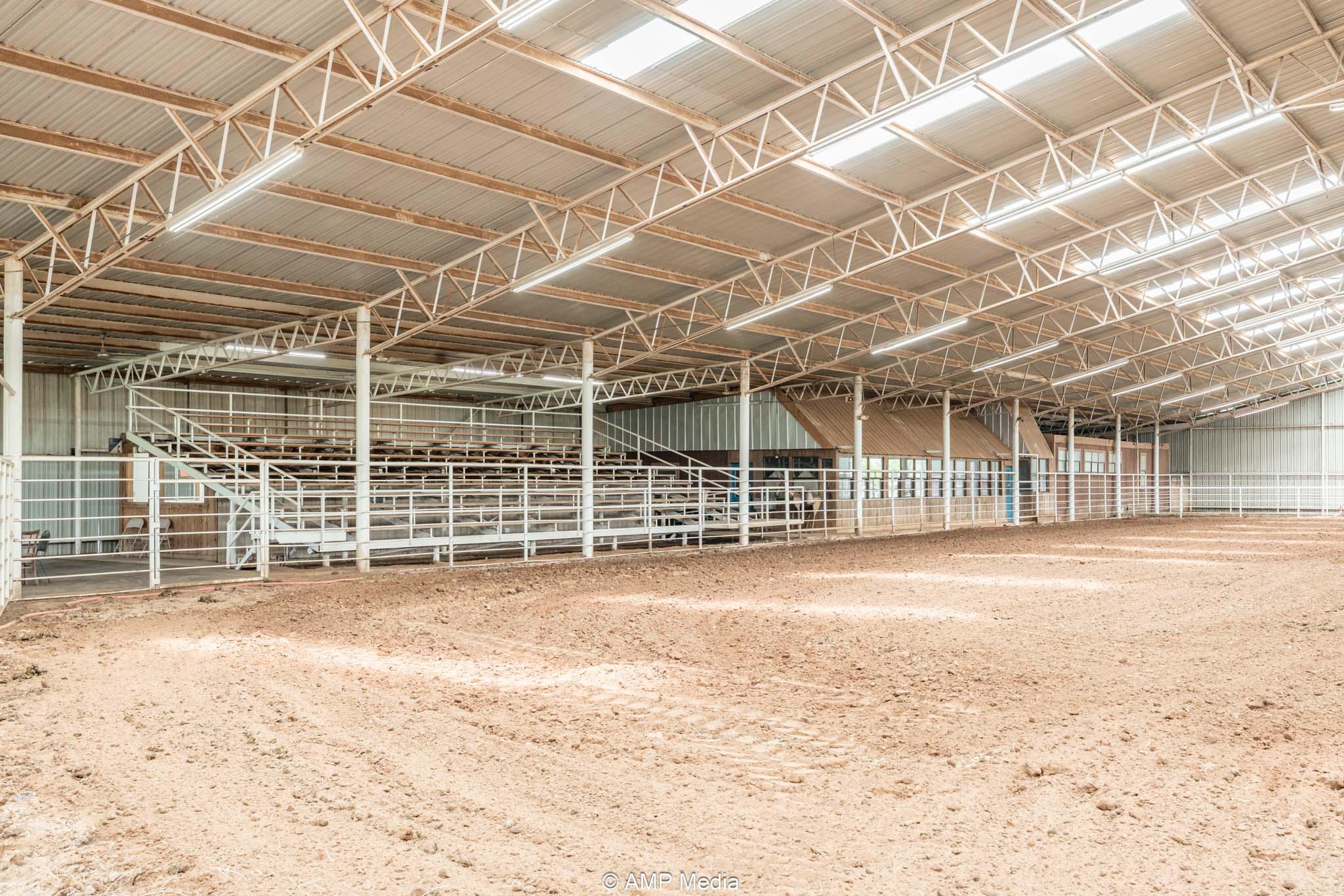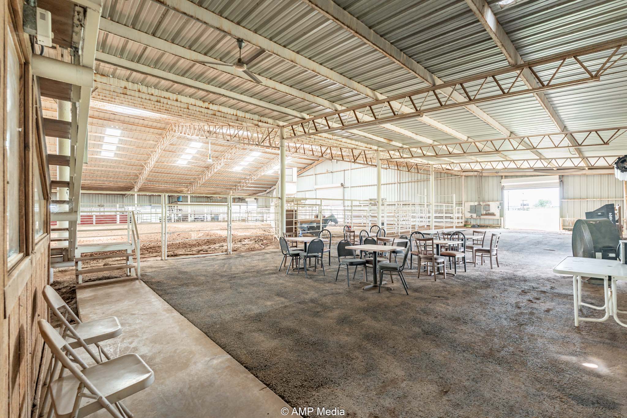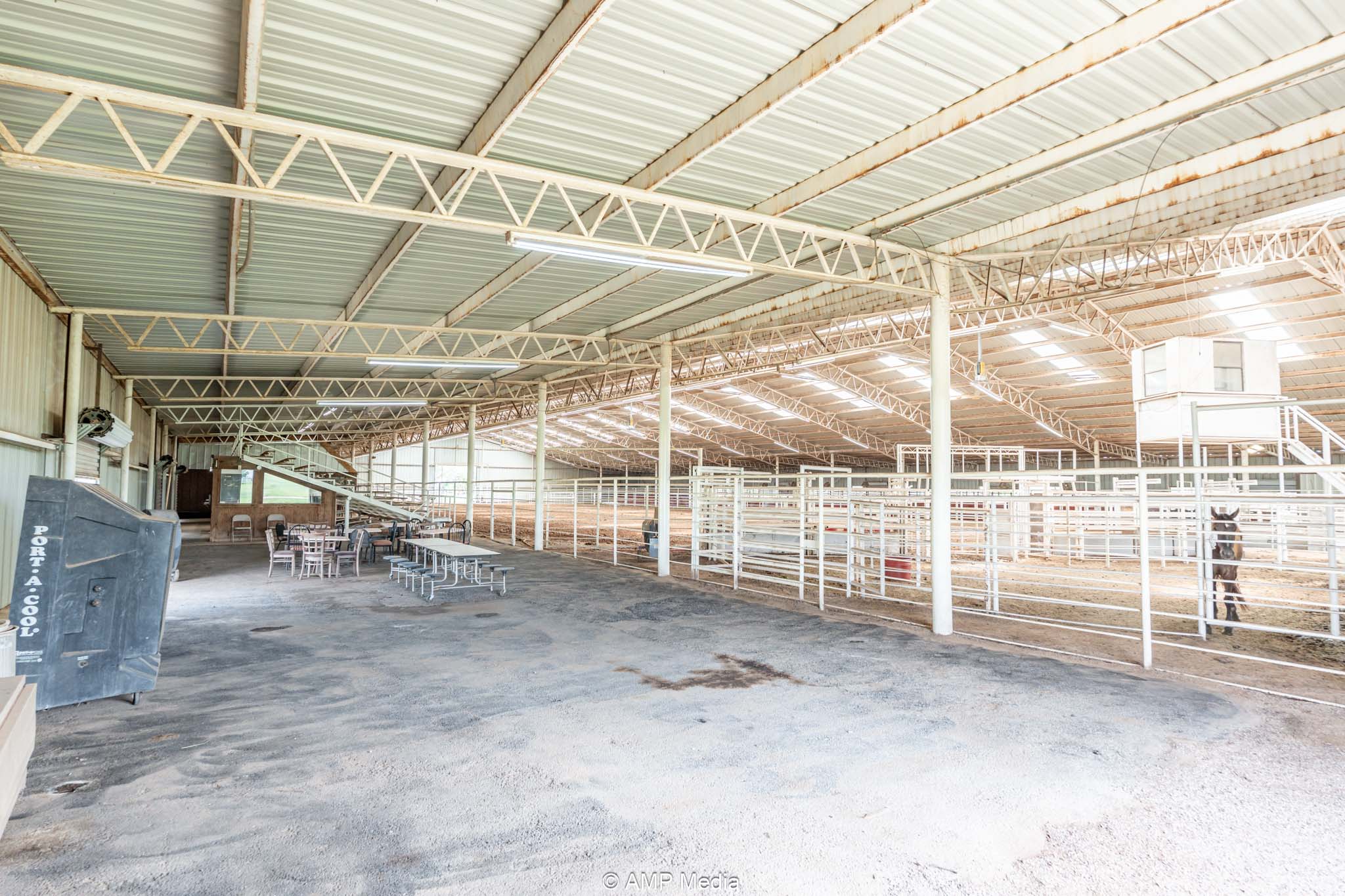 The heart of the property is the expansive professional indoor rodeo arena, ready for year-round events, practices, clinics, or jackpots. It includes four bucking chutes (two right-hand and two left-hand delivery), efficient return alley, and roping chutes for smooth flow. An elevated announcer stand with full PA system, bleacher seating for spectators, and a separate office handle coordination or judging. Men's and women's restrooms (with shower in women's) plus a full concession stand support multi-day use. Three large industrial fans beat the Texas heat, new skylights bring in natural light, and energy-efficient LED lighting illuminates everything. Barrel racers get a competitive edge with roof-mounted laser lights replicating the exact NFR pattern—perfect for elite training.