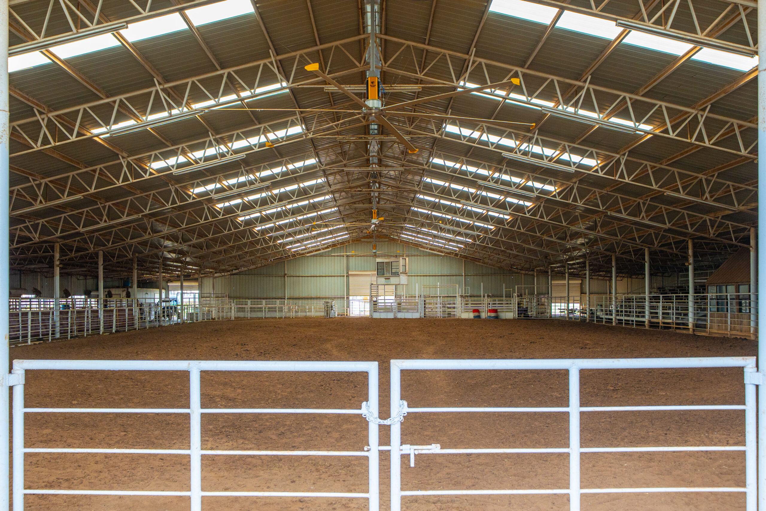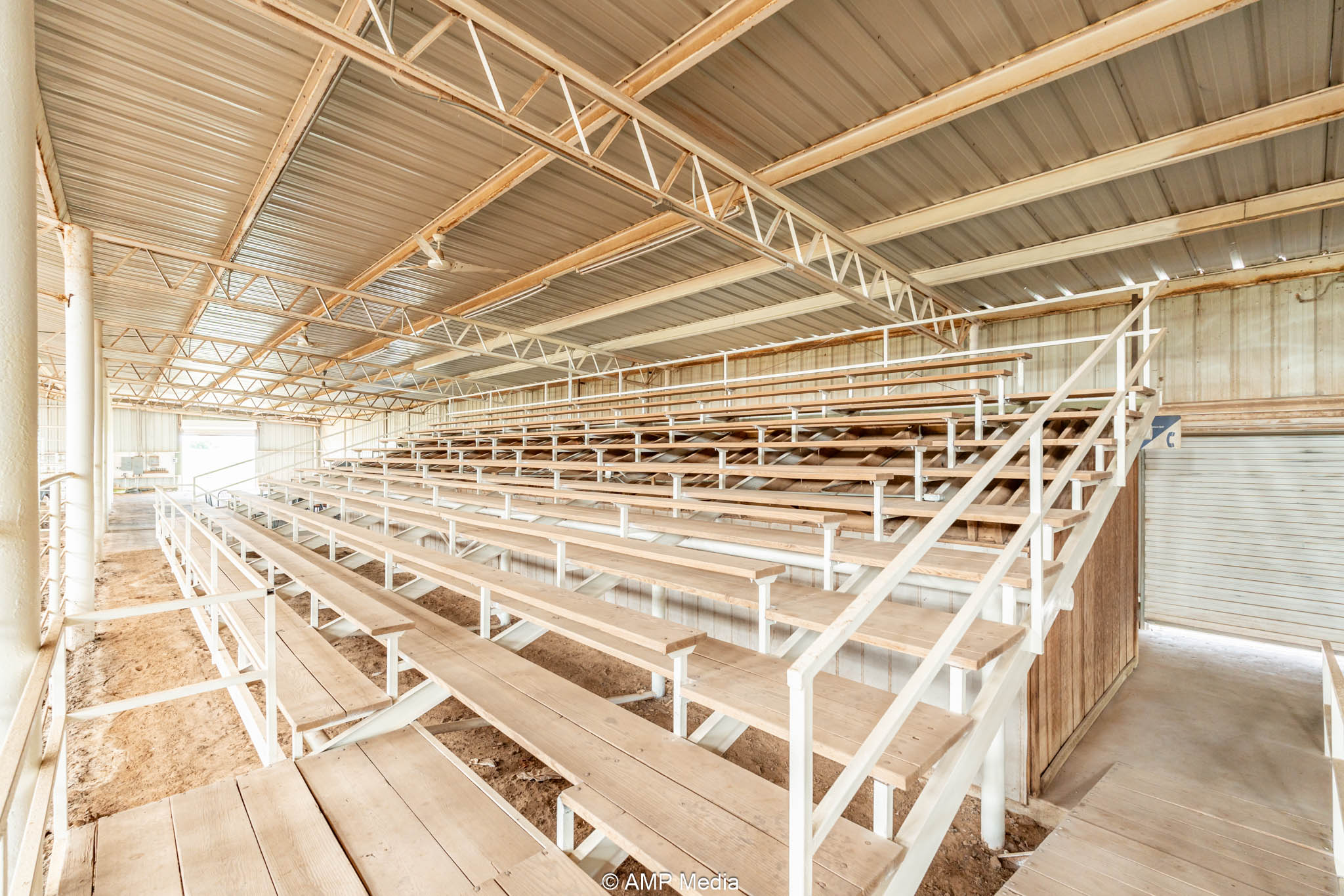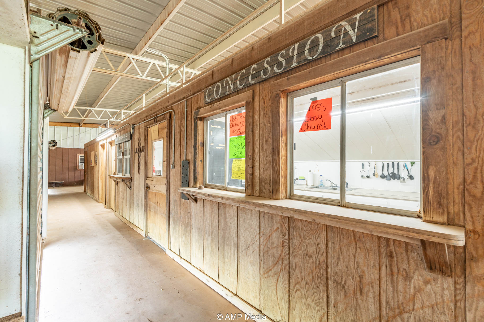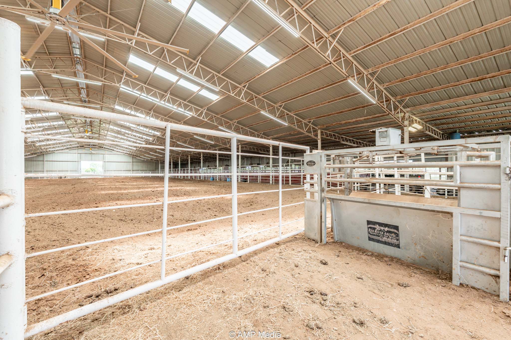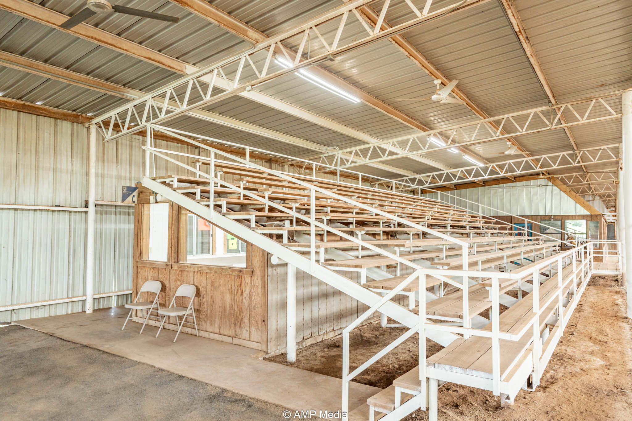 The heart of the property is the expansive professional indoor rodeo arena, ready for year-round events, practices, clinics, or jackpots. It includes four bucking chutes (two right-hand and two left-hand delivery), efficient return alley, and roping chutes for smooth flow. An elevated announcer stand with full PA system, bleacher seating for spectators, and a separate office handle coordination or judging. Men's and women's restrooms (with shower in women's) plus a full concession stand support multi-day use. Three large industrial fans beat the Texas heat, new skylights bring in natural light, and energy-efficient LED lighting illuminates everything. Barrel racers get a competitive edge with roof-mounted laser lights replicating the exact NFR pattern—perfect for elite training.
