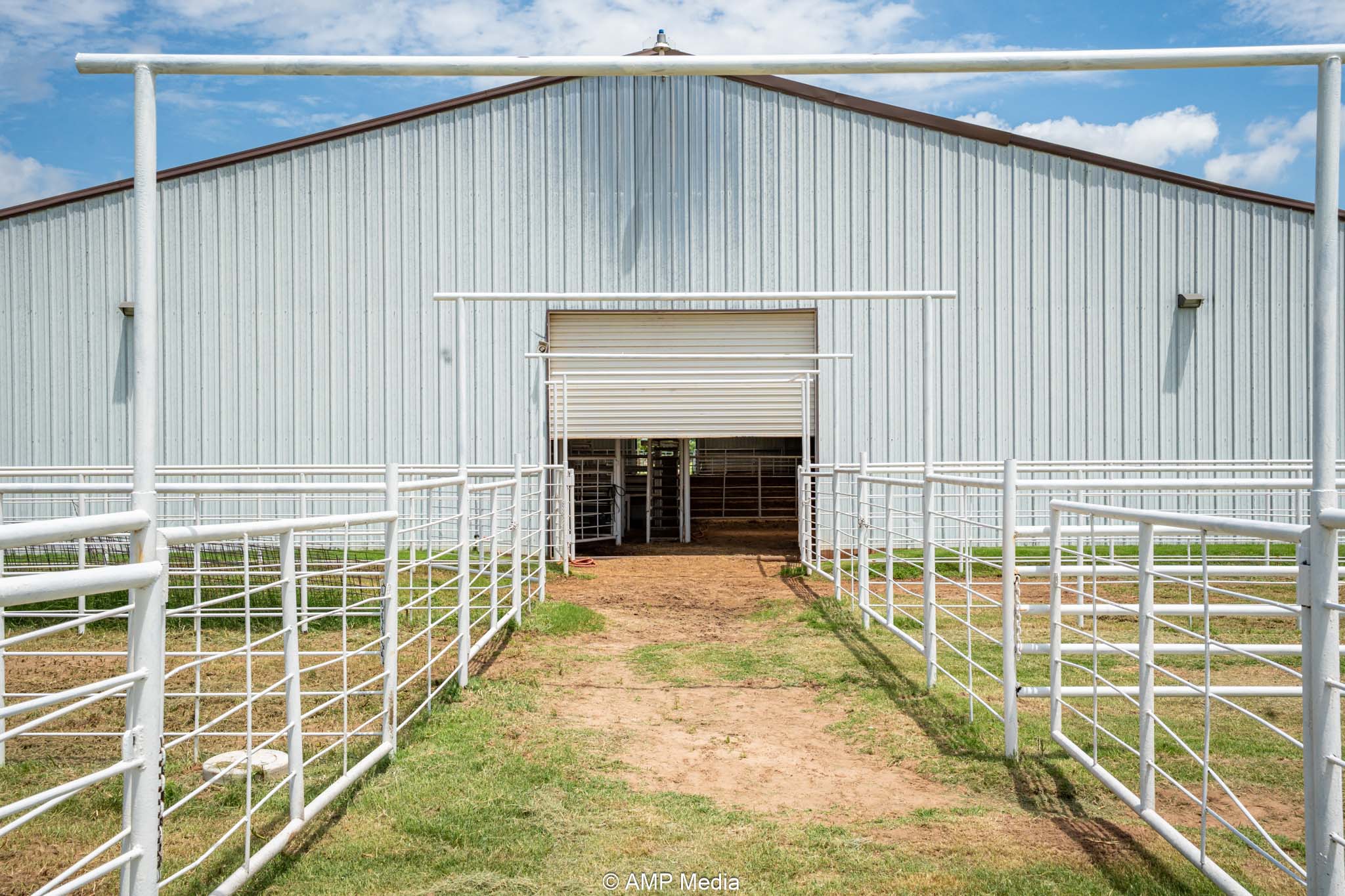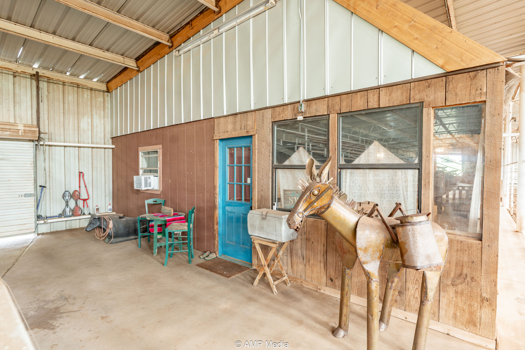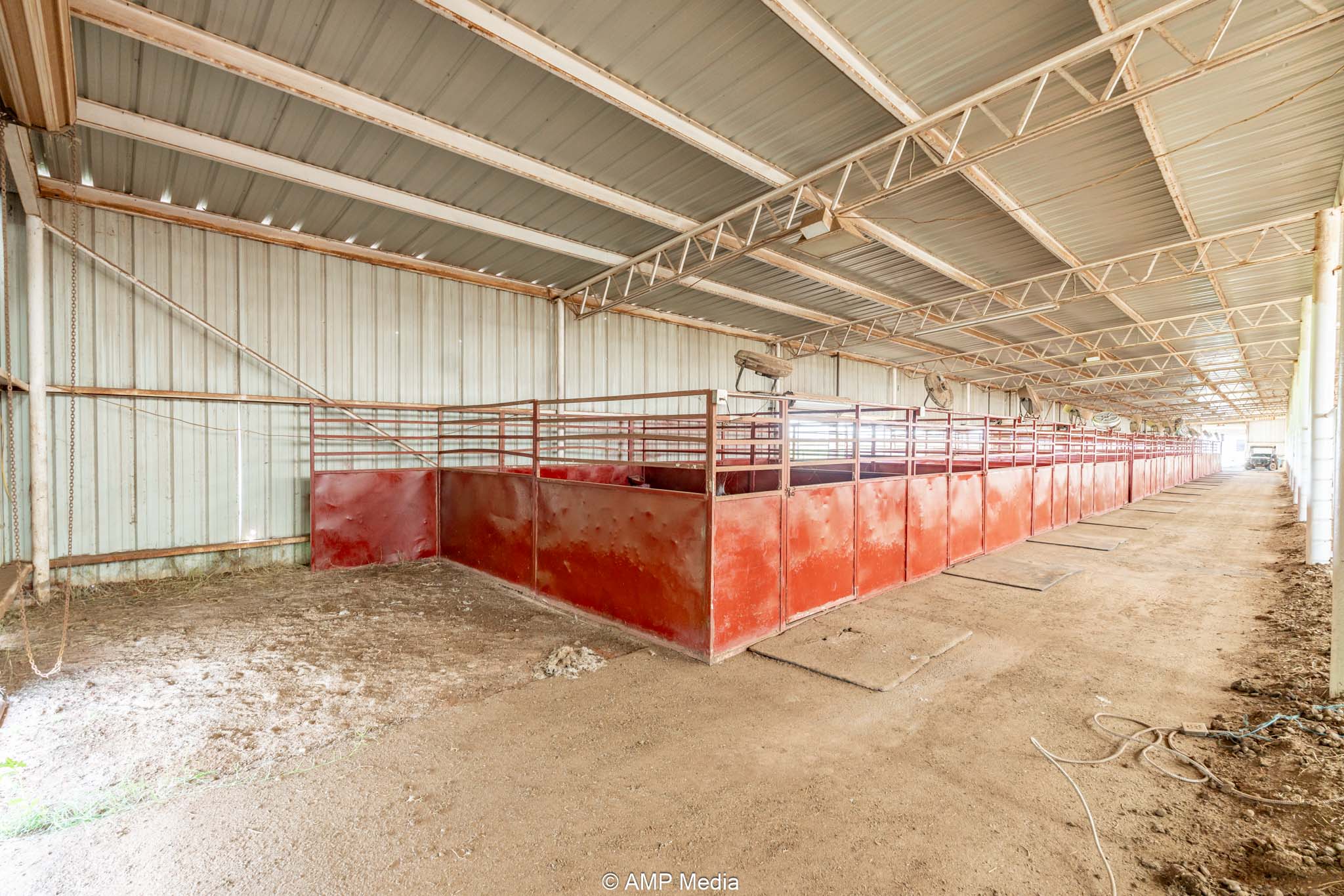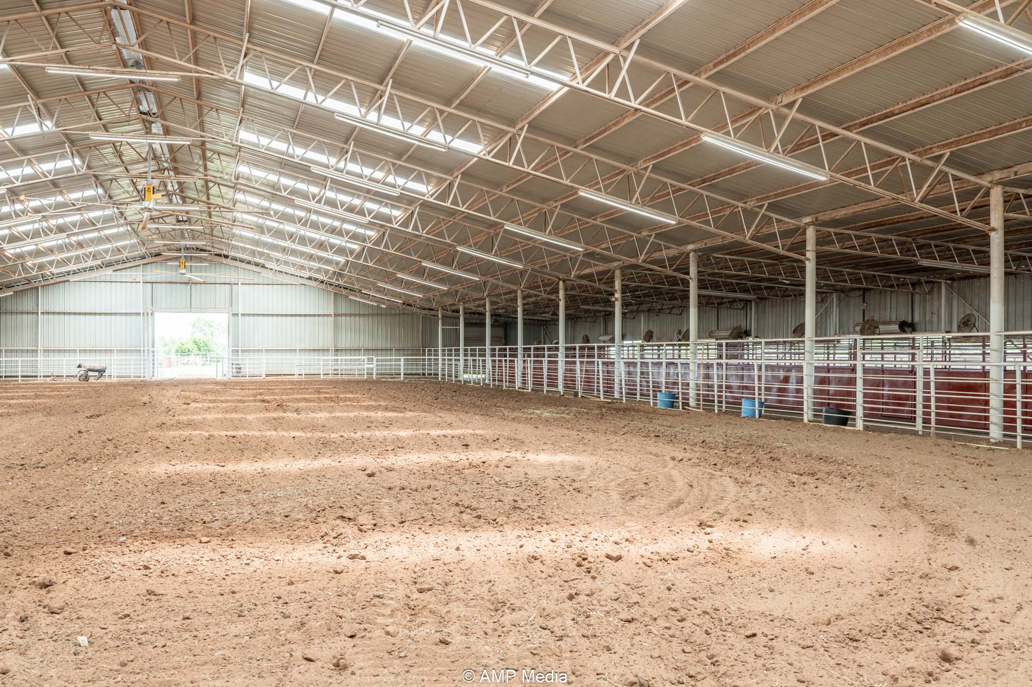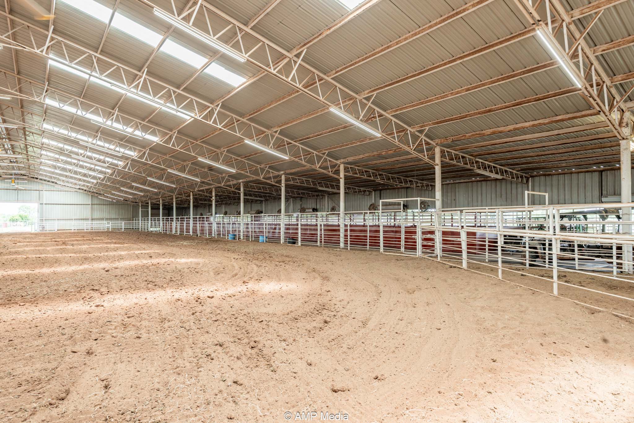 South side: 12 indoor stalls with individual fans keep horses comfortable, backed by an insulated tack room with rotating saddle rack for up to 12 saddles and a separate feed room. Partially covered outdoor stalls add easy potential for another 15 stalls with finishing work, scaling up boarding or training capacity.