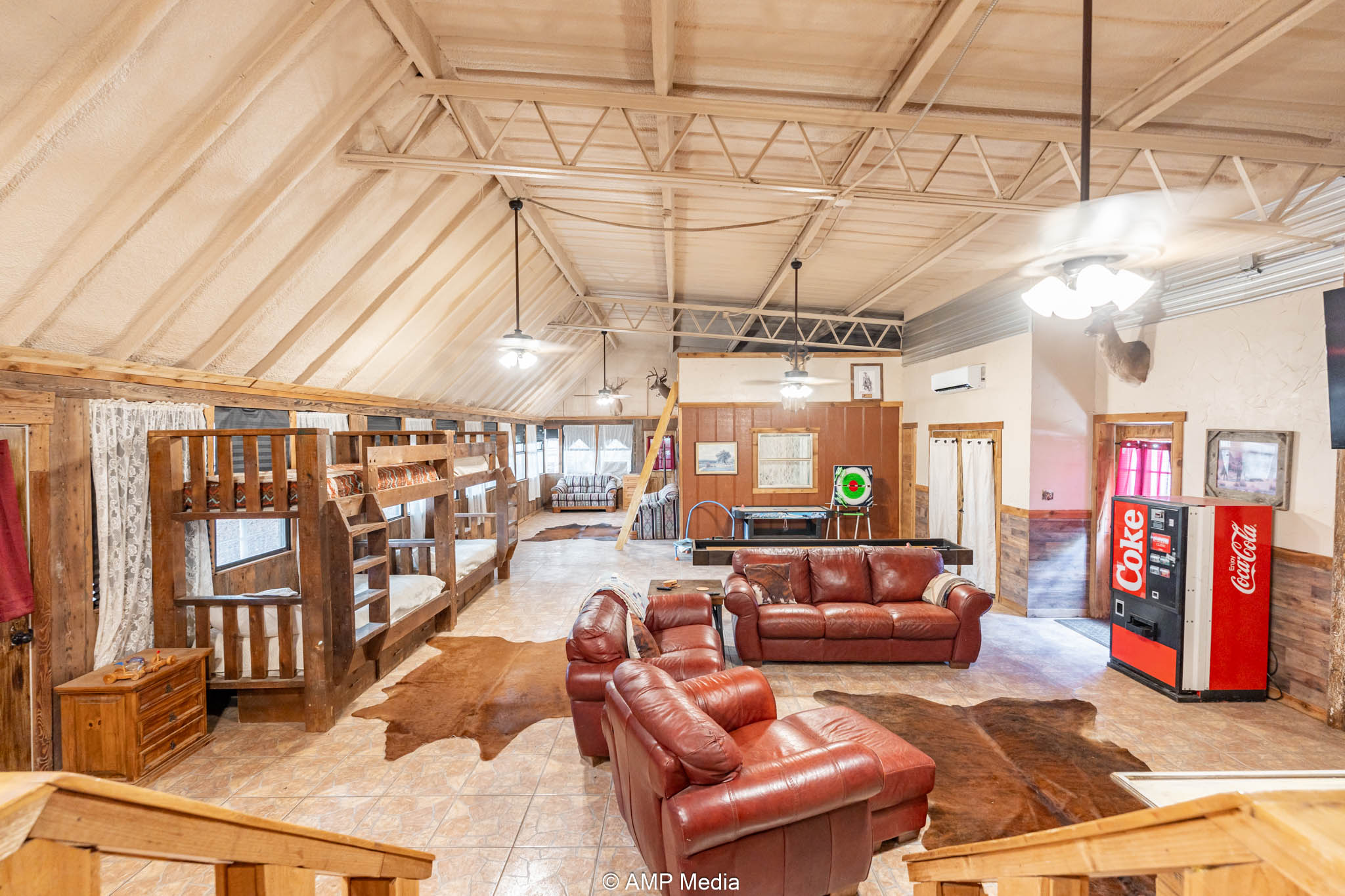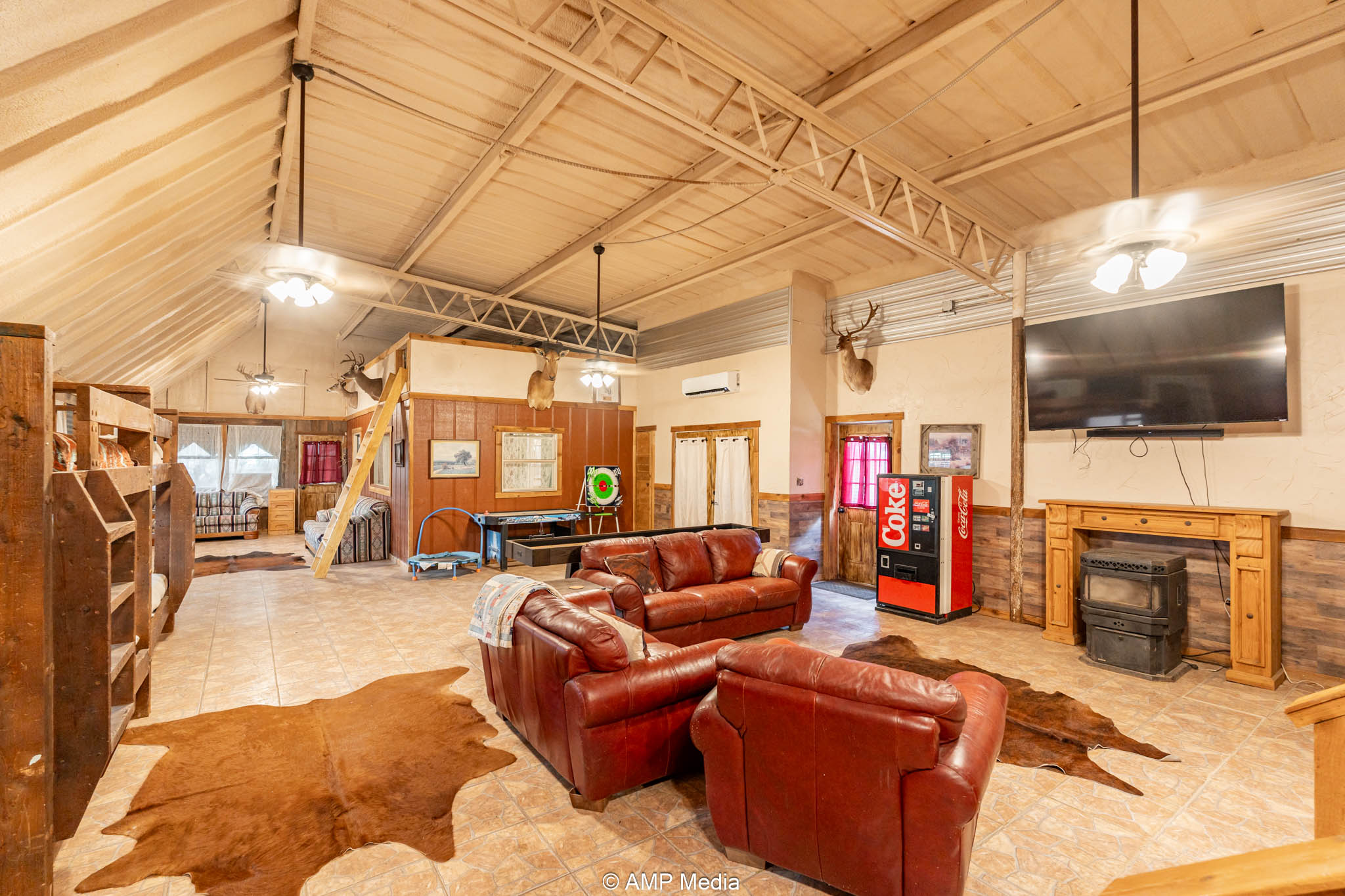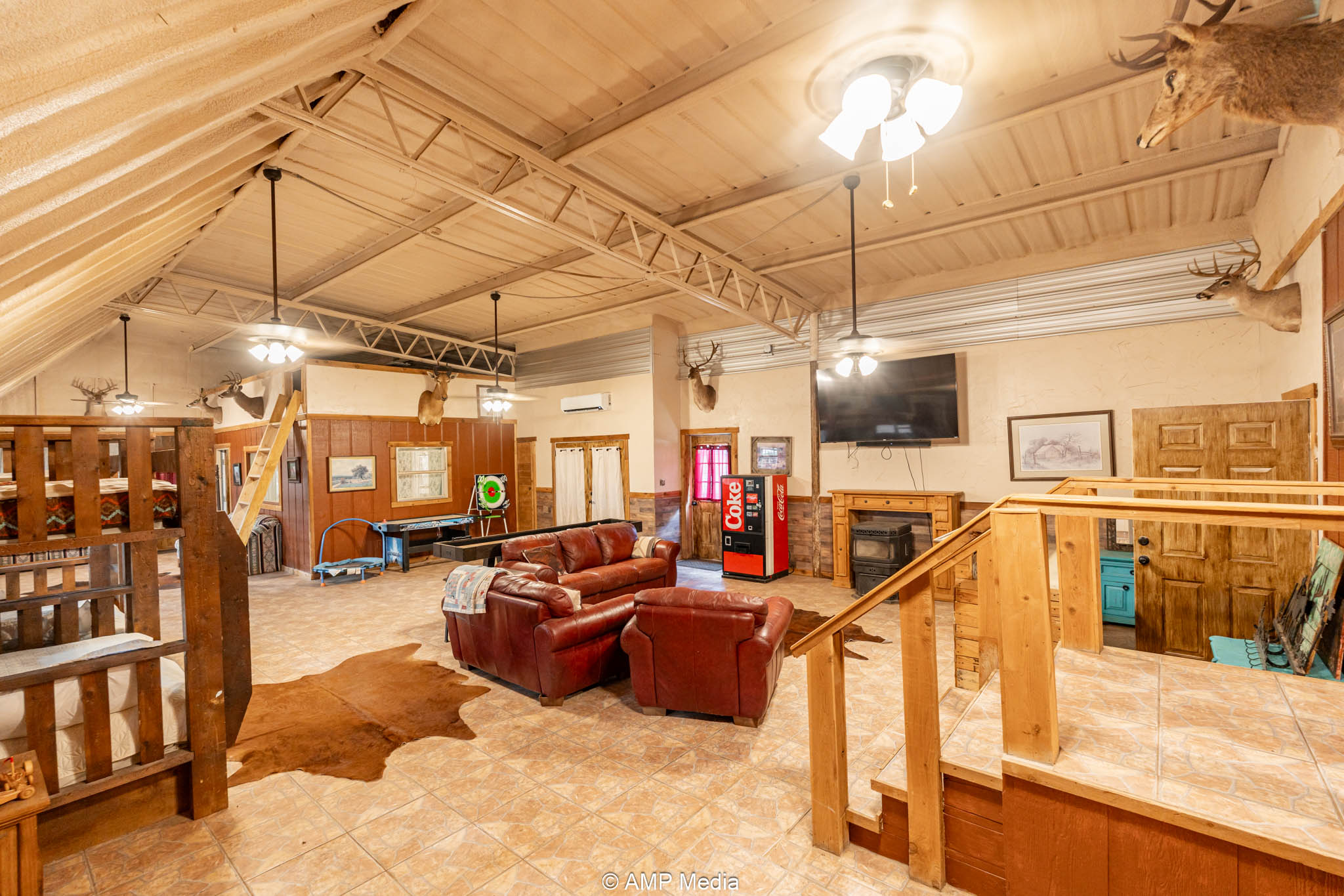 Under the same roof: the updated 2-bedroom, 3-bath apartment (built by Trevor) features a loft, large den with mini-split cooling, and central heat/air—ideal for on-site living, managers, or trainers.