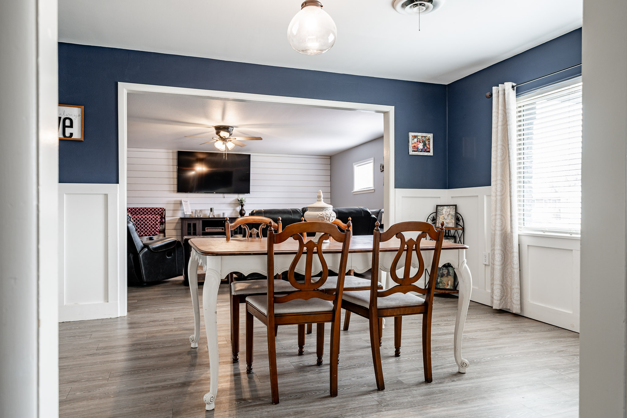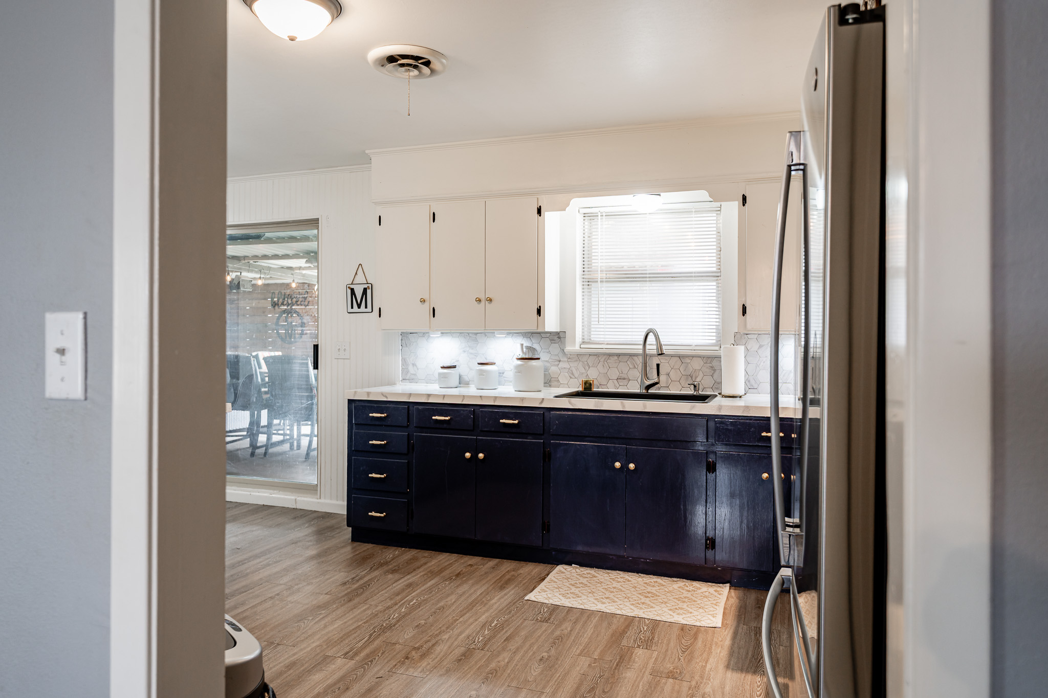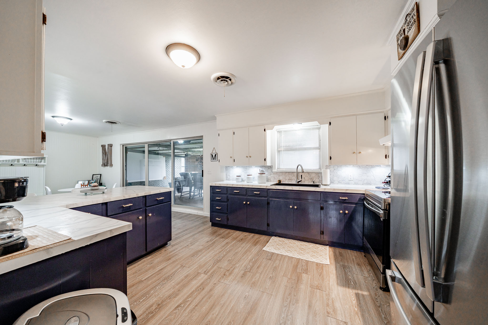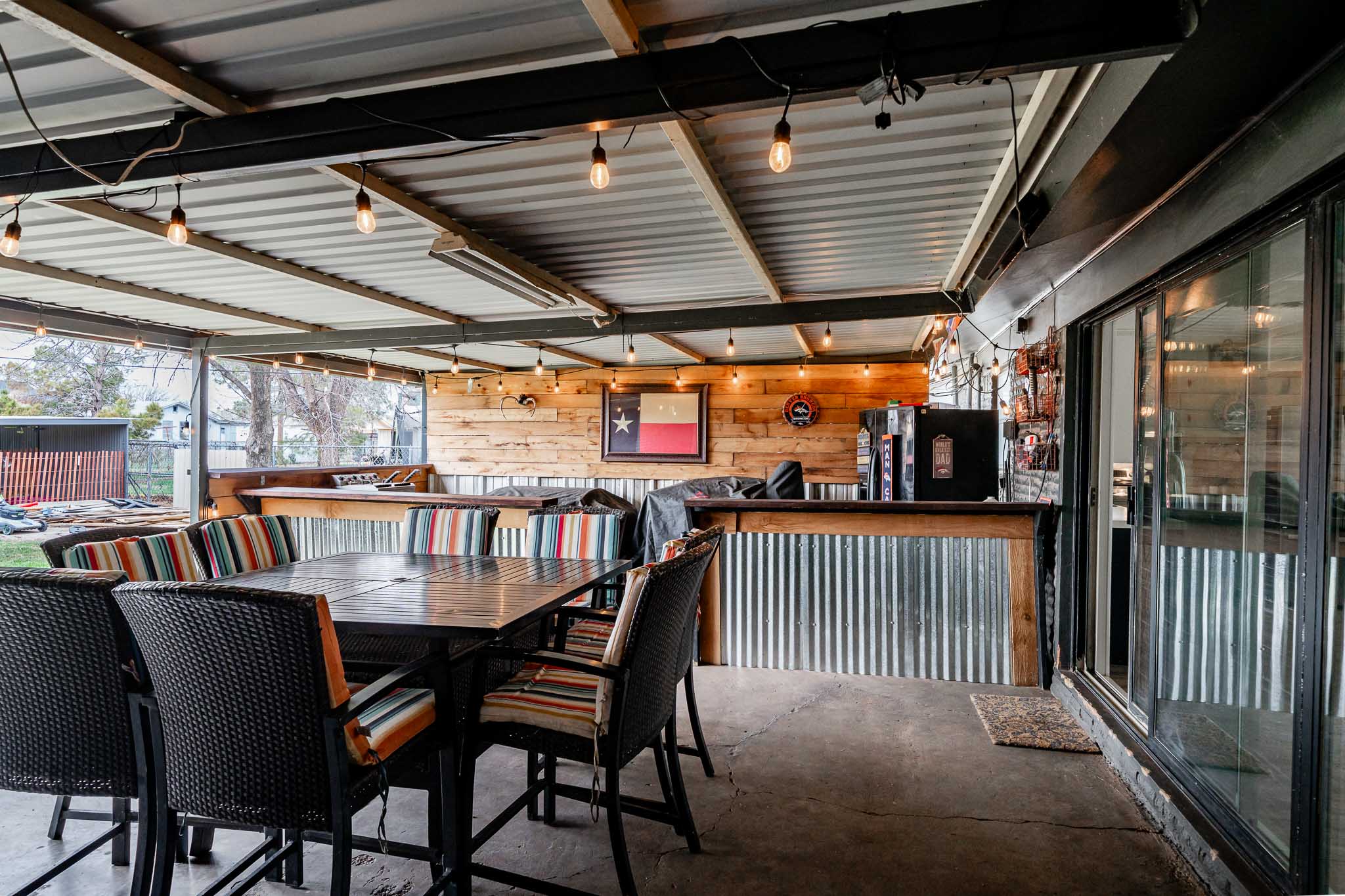 The updated kitchen offers plenty of space for casual eating, but the real showstopper is the view through massive windows to an incredible outdoor entertaining oasis: a projection screen with seating for movie nights or game days, a dedicated eating area, bar/cook shack complete with appliances, firepit, animal enclosure with storage, and a workshop ready for some TLC.