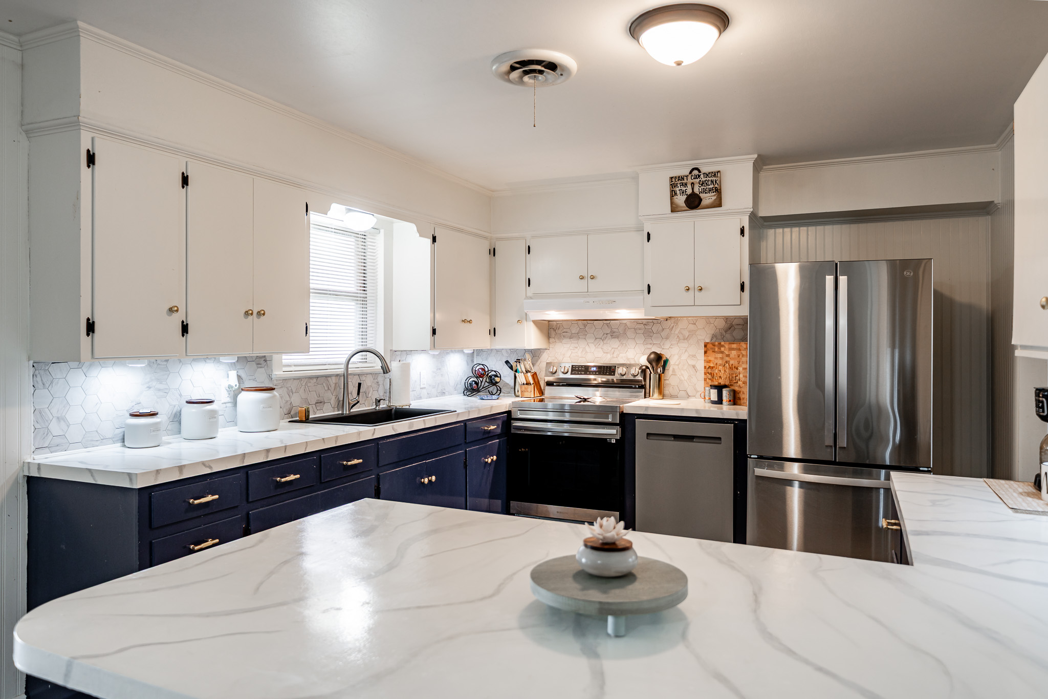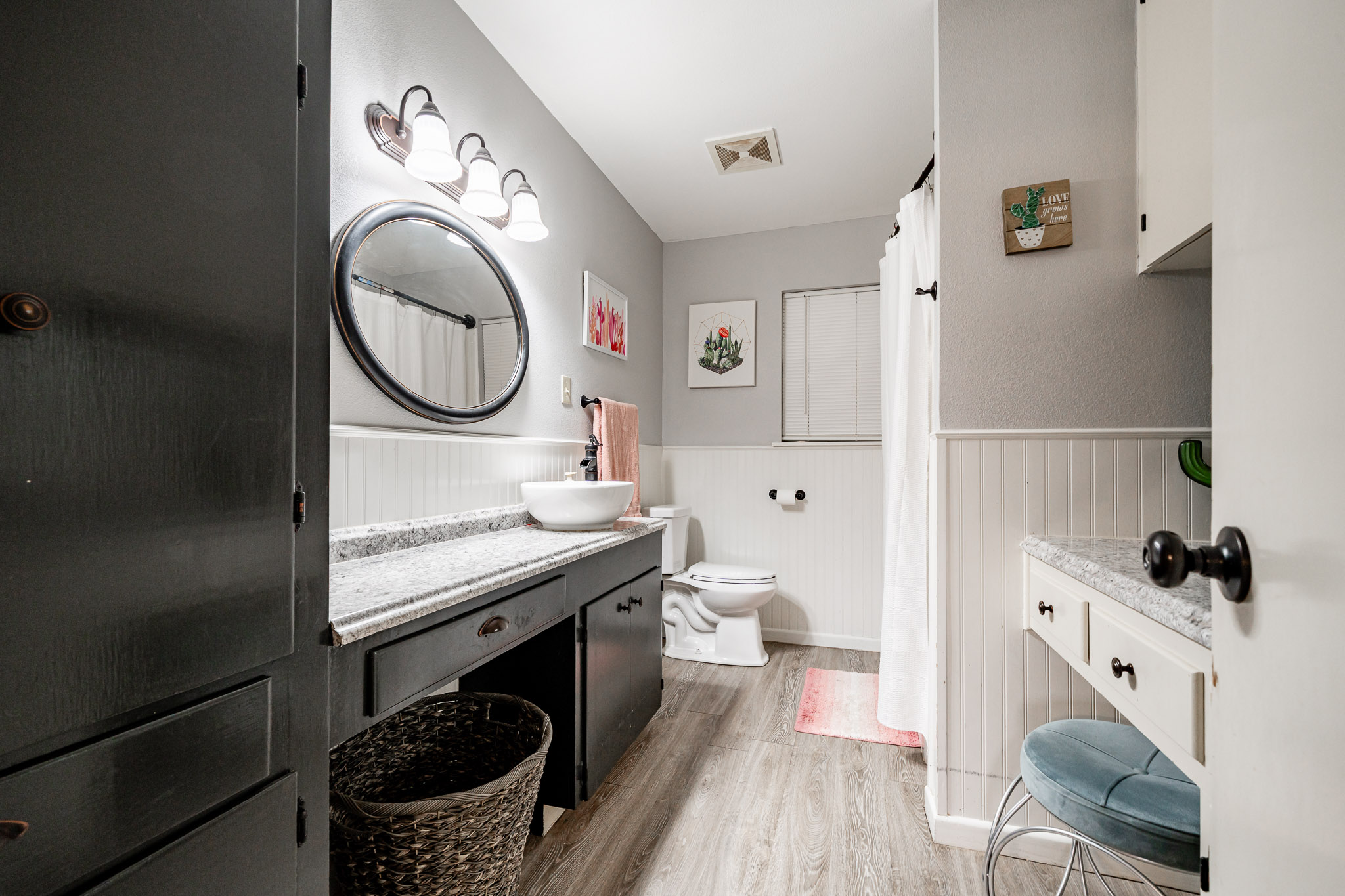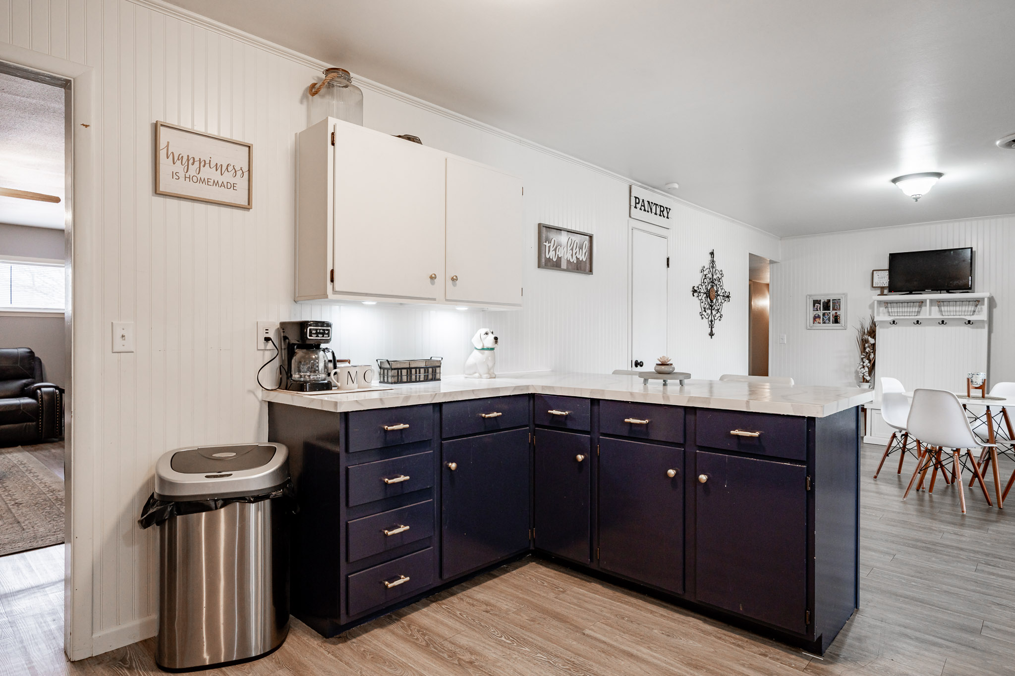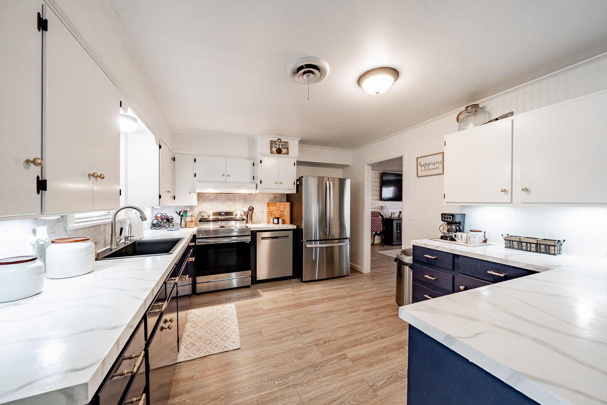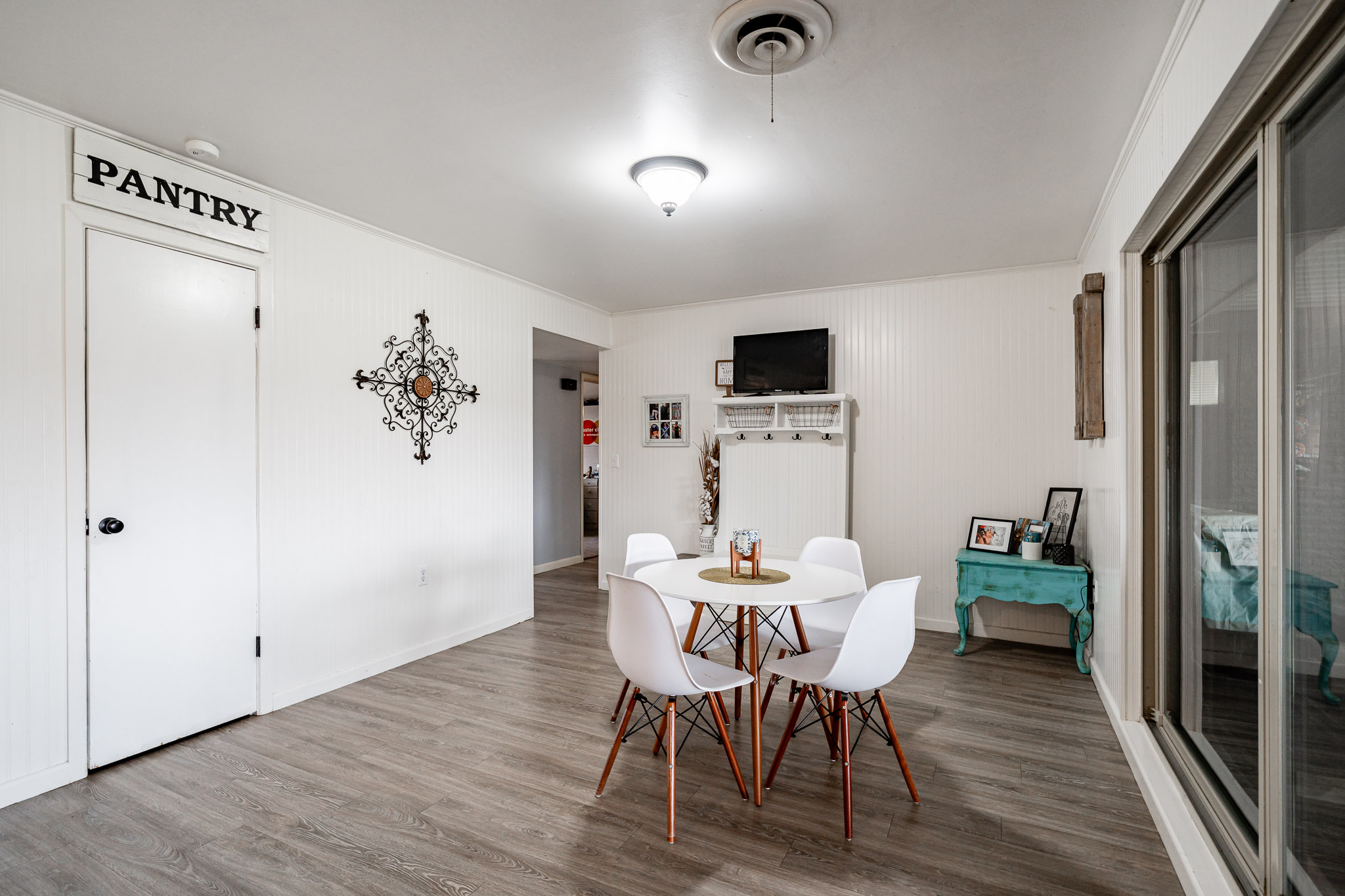 The updated kitchen offers plenty of space for casual eating, but the real showstopper is the view through massive windows to an incredible outdoor entertaining oasis: a projection screen with seating for movie nights or game days, a dedicated eating area, bar/cook shack complete with appliances, firepit, animal enclosure with storage, and a workshop ready for some TLC.