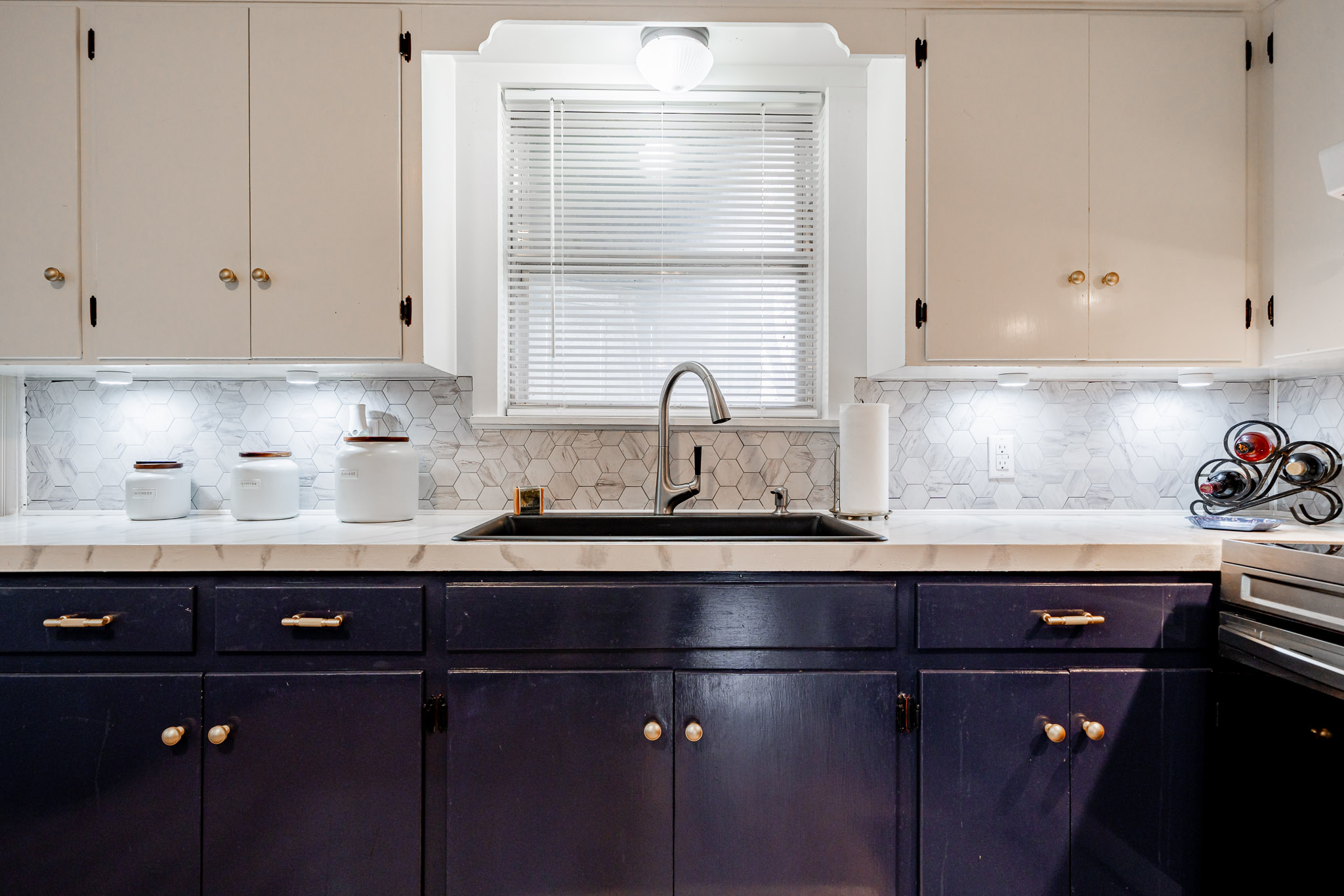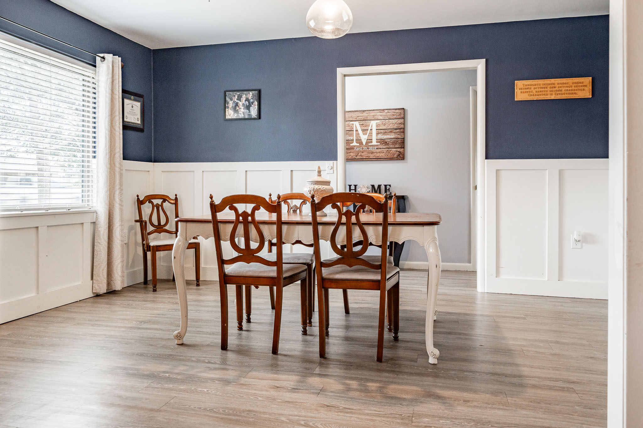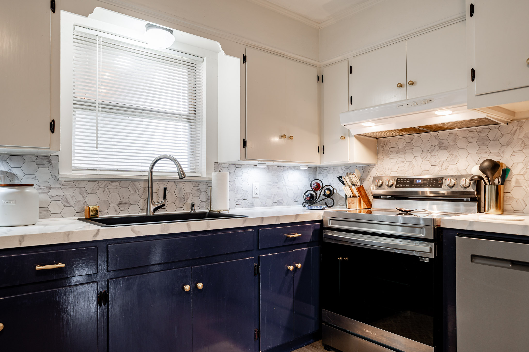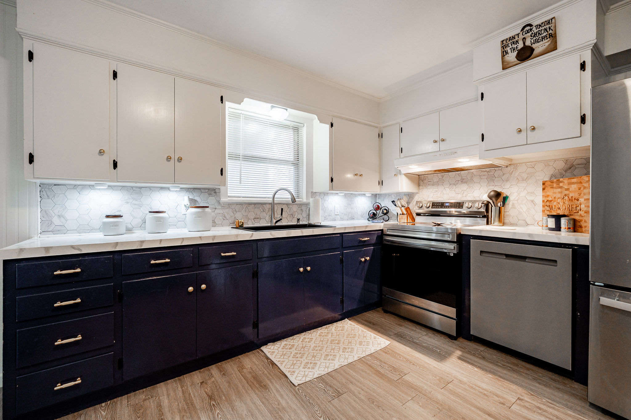 The updated kitchen offers plenty of space for casual eating, but the real showstopper is the view through massive windows to an incredible outdoor entertaining oasis: a projection screen with seating for movie nights or game days, a dedicated eating area, bar/cook shack complete with appliances, firepit, animal enclosure with storage, and a workshop ready for some TLC.