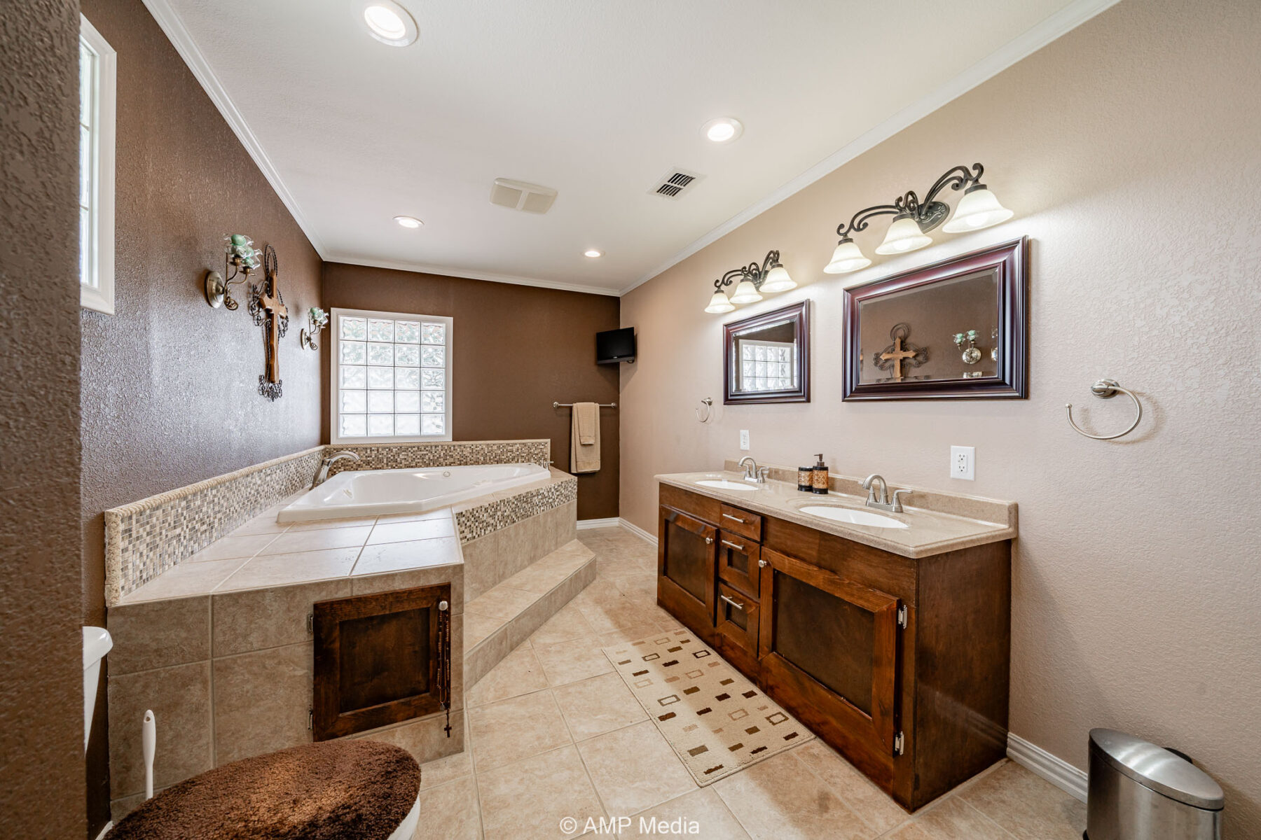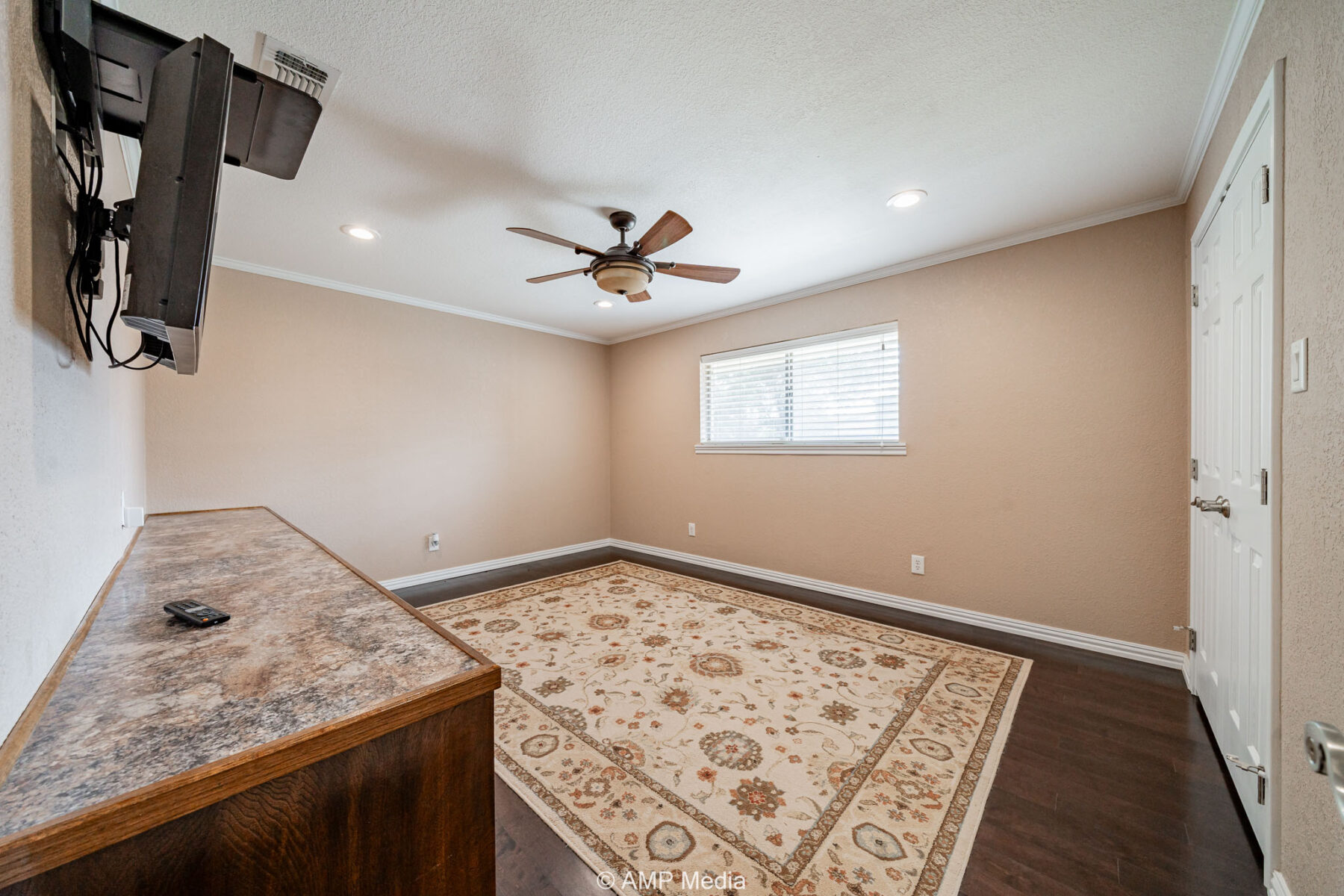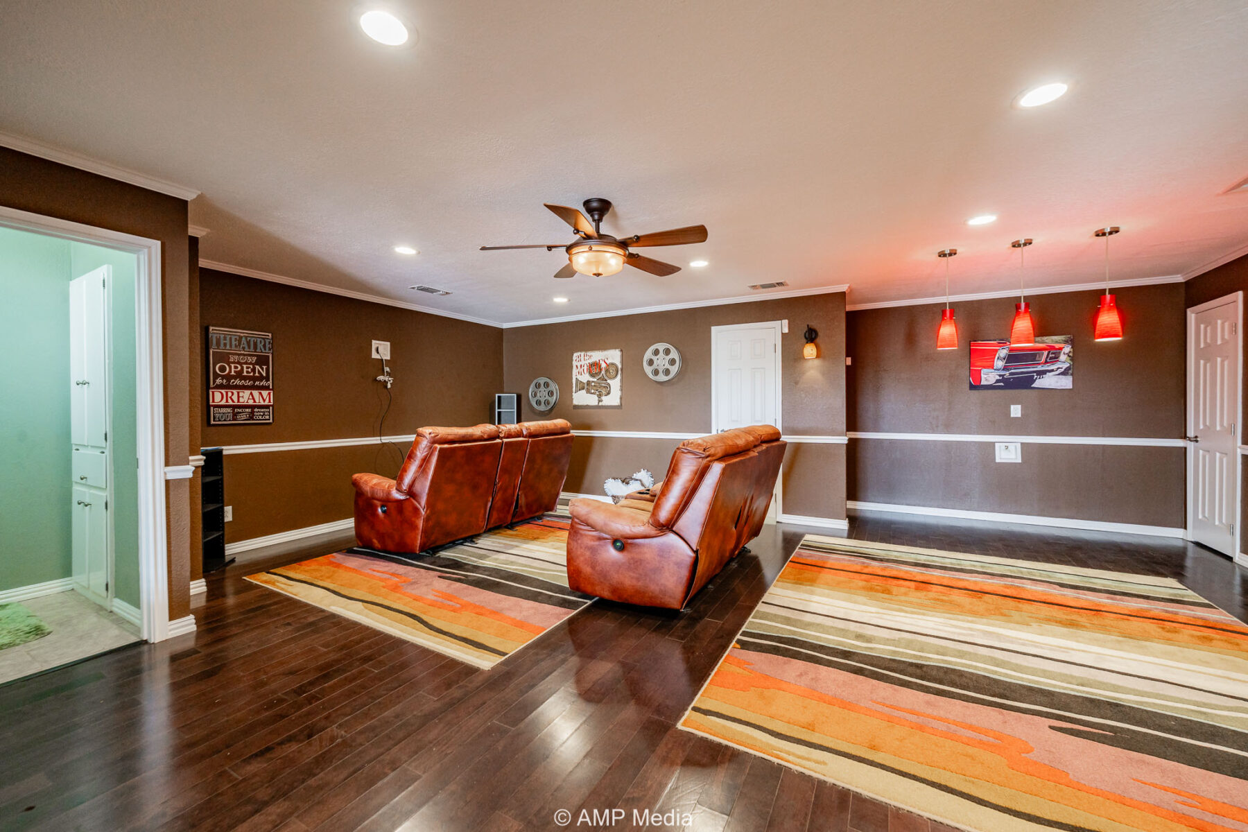 The interior features a large media room, formal dining area, dedicated office, and a welcoming foyer with warm wood accents. The gourmet kitchen is a chef’s dream, complete with a breakfast bar, gas stove, refrigerator, and double ovens.