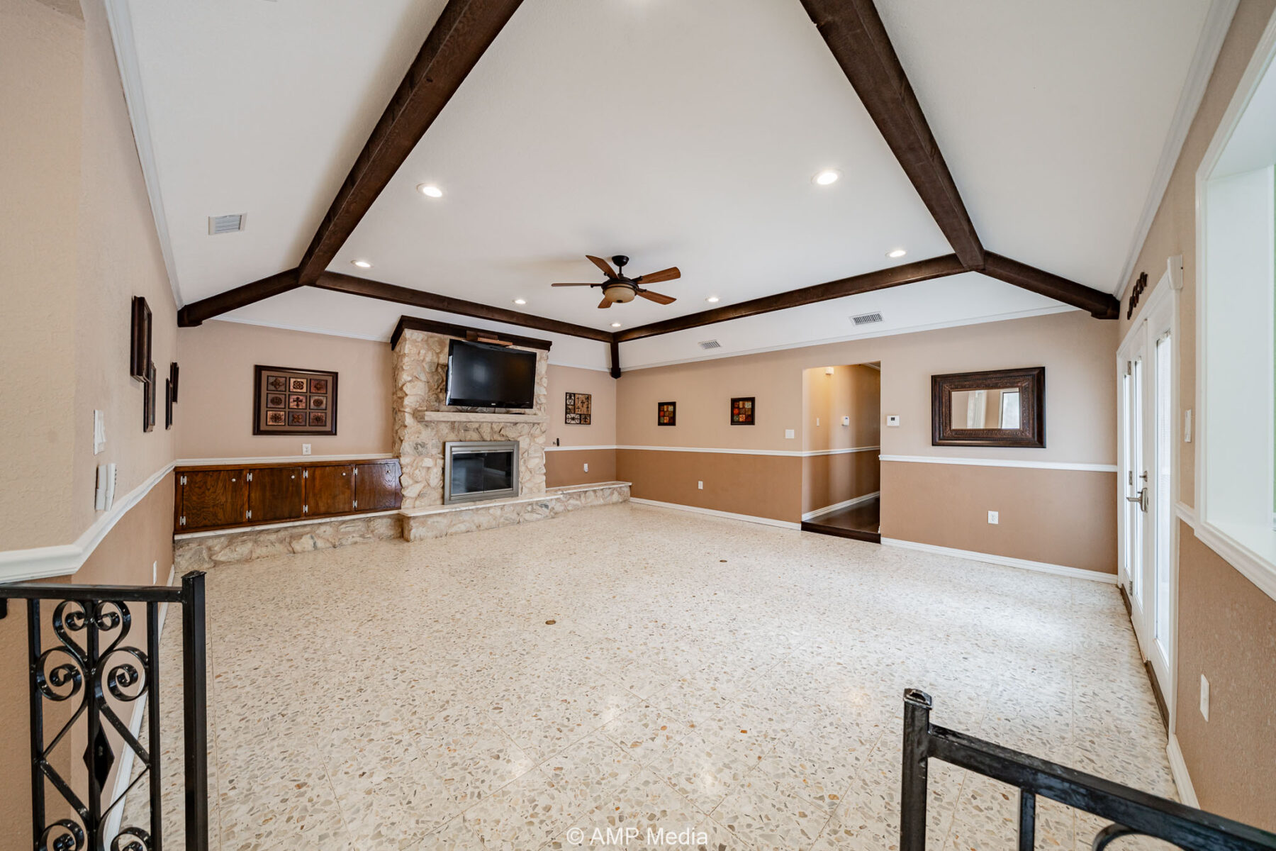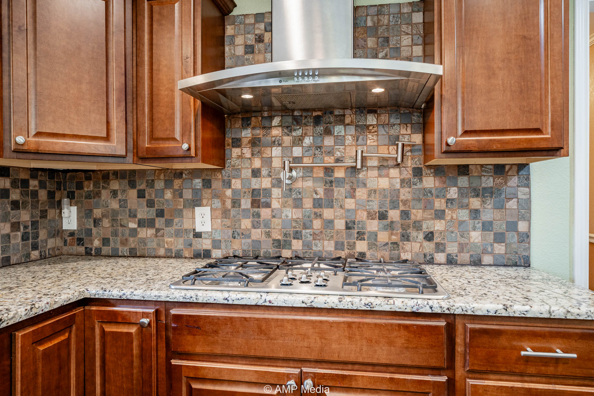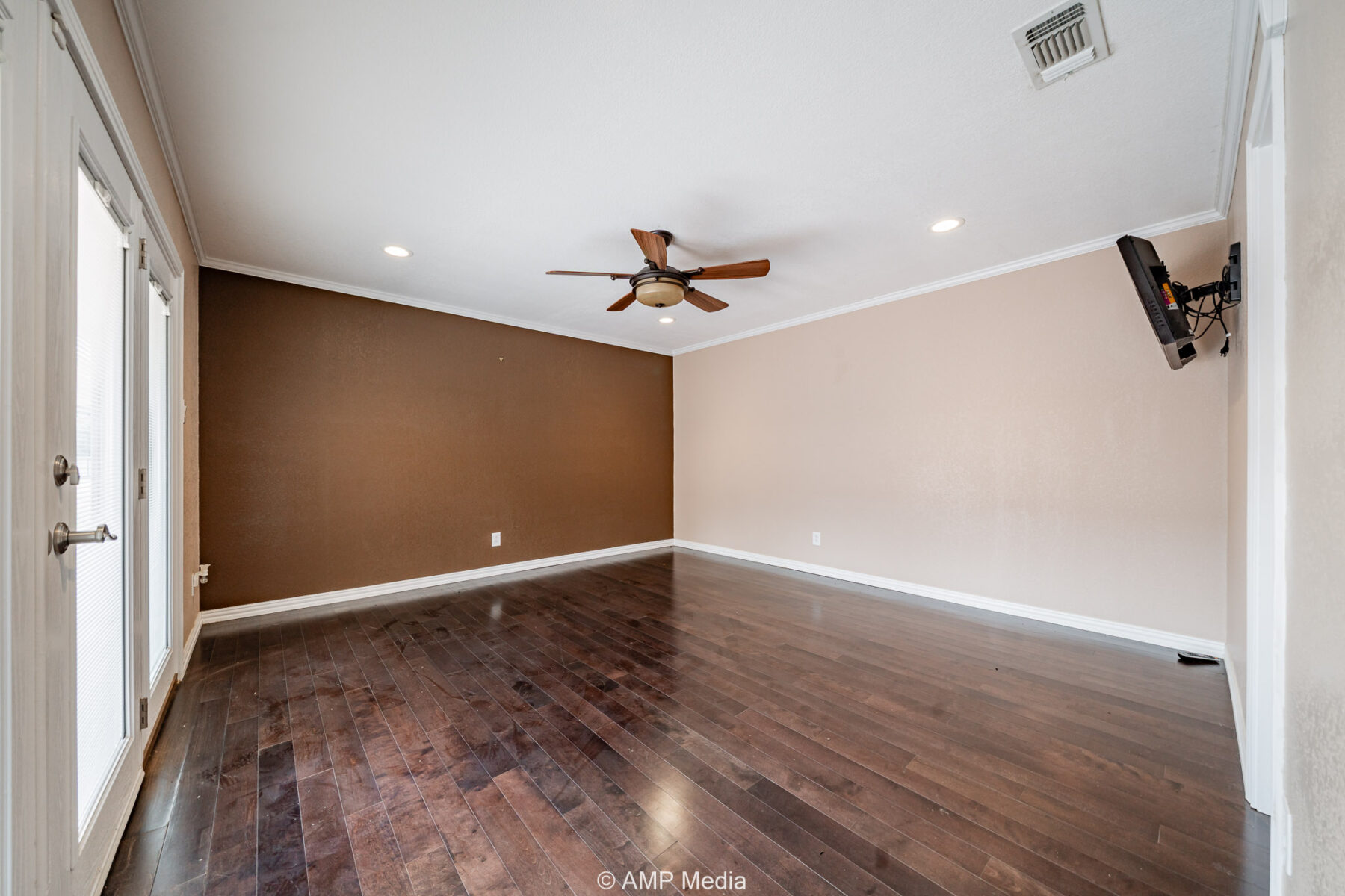 The interior features a large media room, formal dining area, dedicated office, and a welcoming foyer with warm wood accents. The gourmet kitchen is a chef’s dream, complete with a breakfast bar, gas stove, refrigerator, and double ovens.