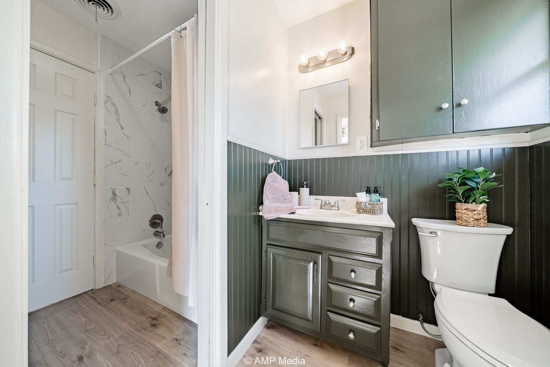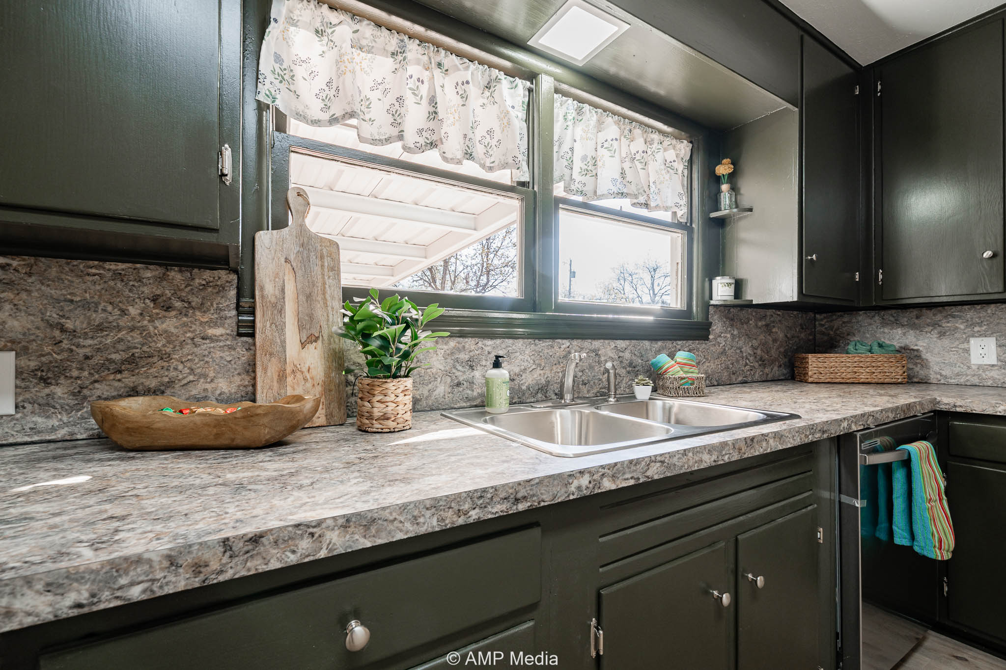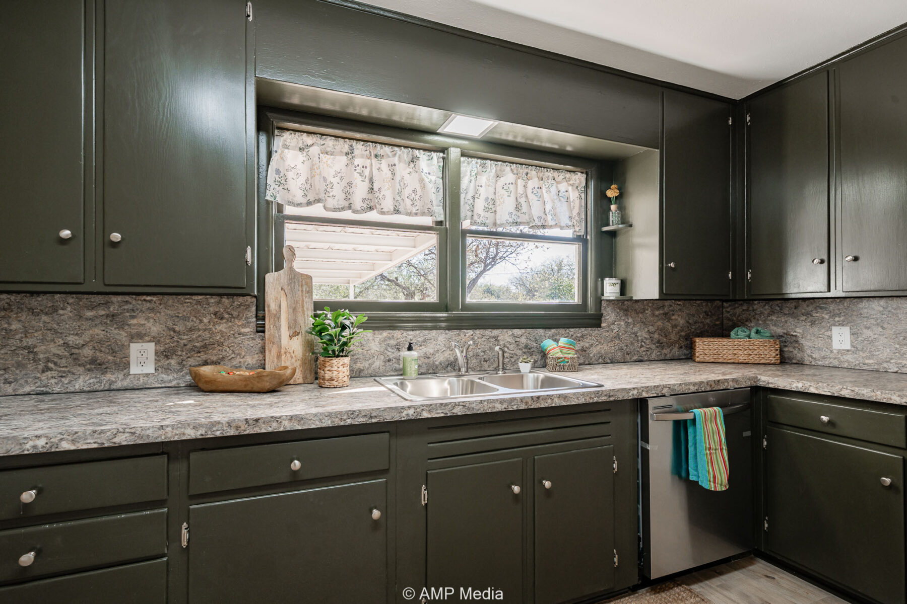 The kitchen has been updated with new countertops, a new sink, dishwasher, vent-a-hood, updated faucet, and cabinets painted in a gorgeous olive green, complemented by sunny windows that fill the space with natural light. The bathroom features updated fixtures and a separate shower with beautiful marble-look ceramic tile.
