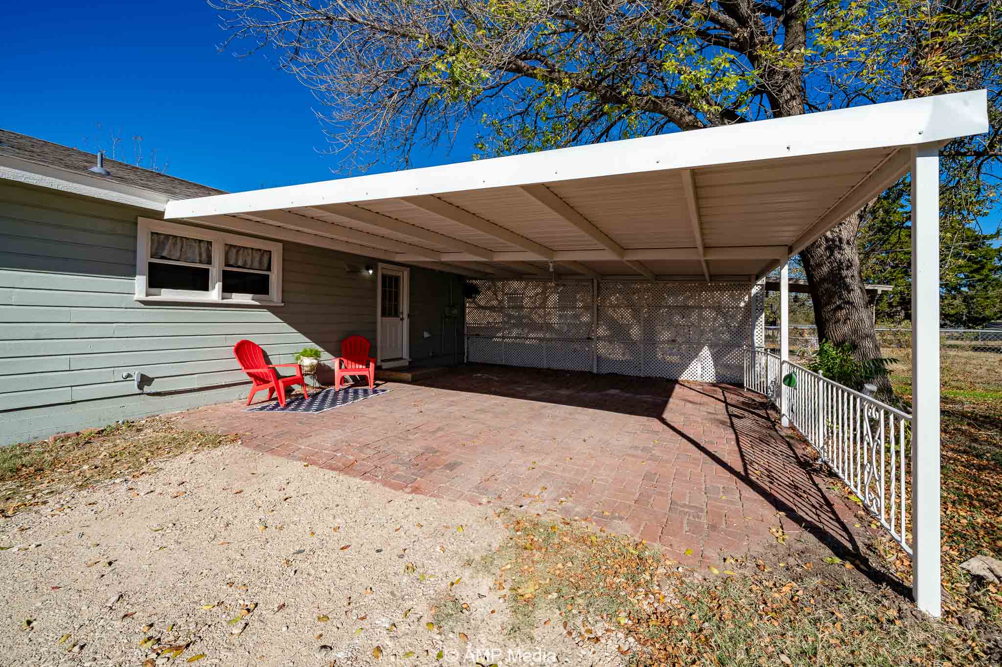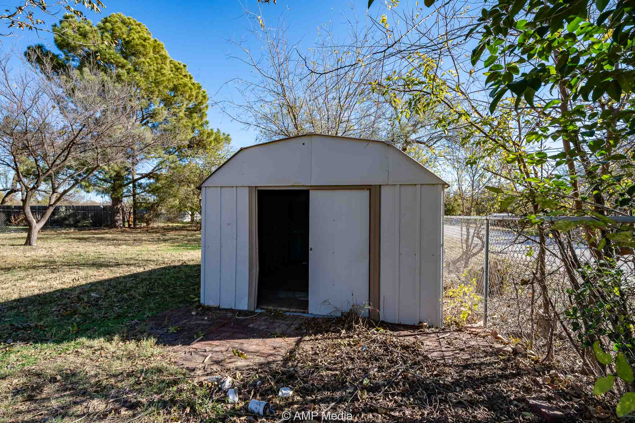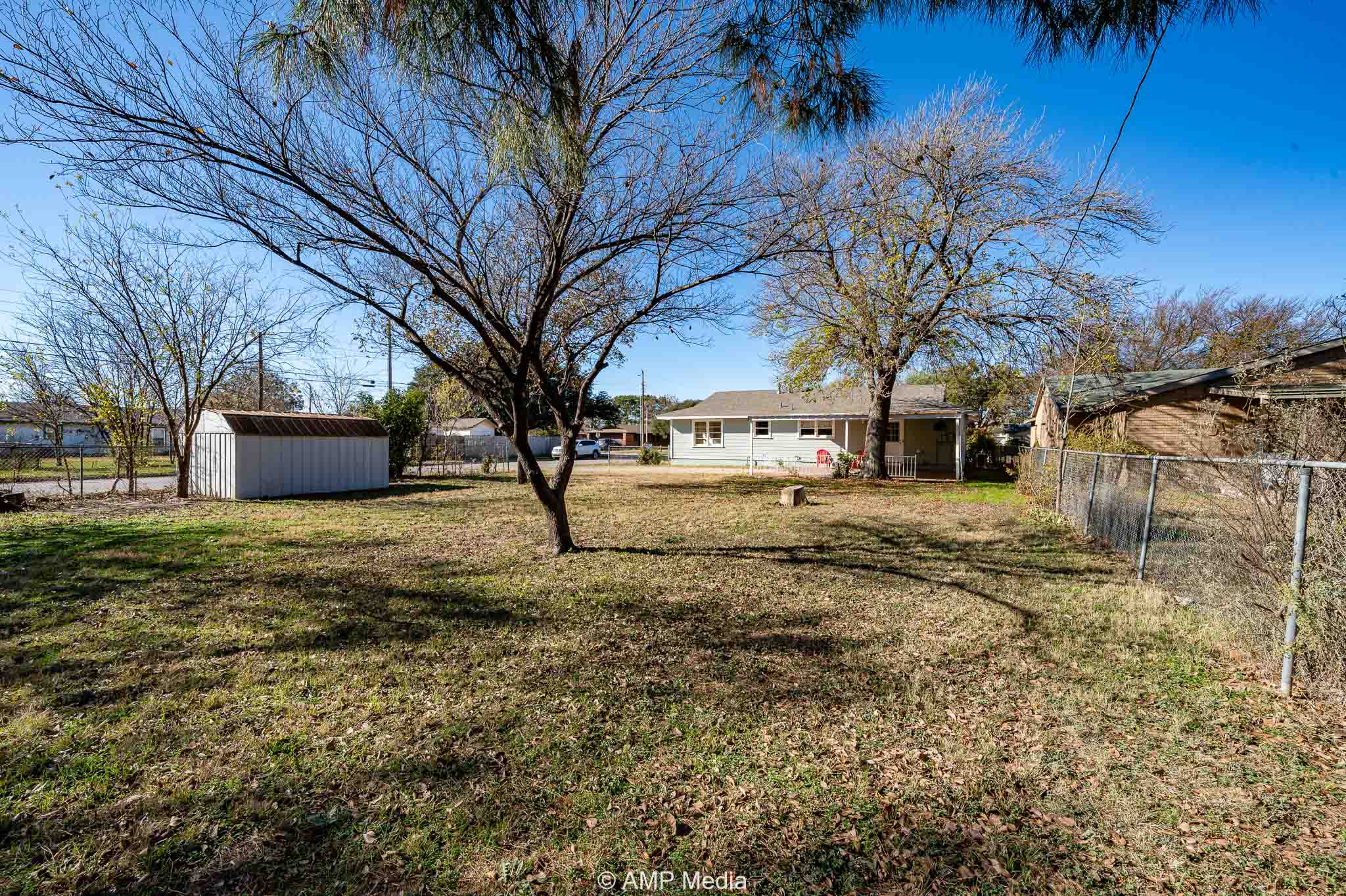 The backyard features a chain-link fence, a double-carport with a covered patio ideal for outdoor living, a large backyard perfect for family cookouts, and a storage shed. This remodel won’t last long!
