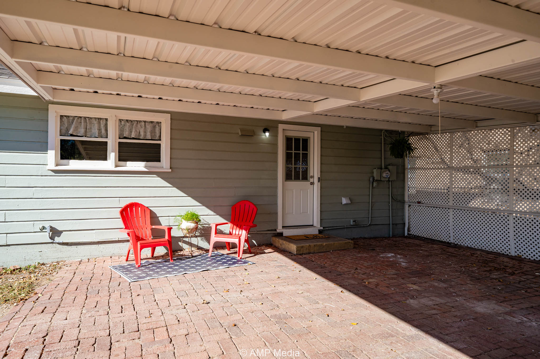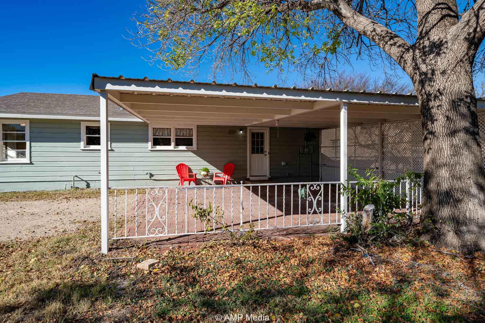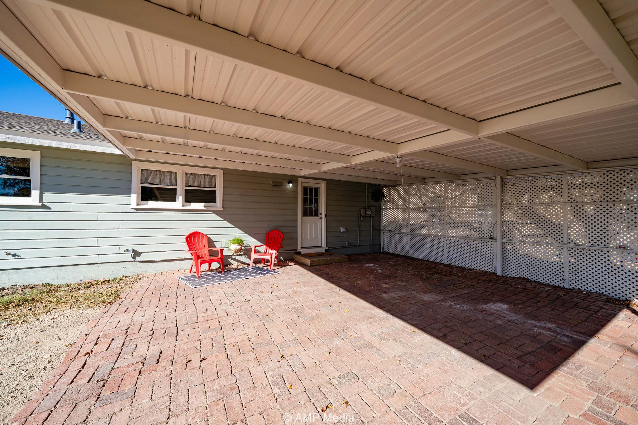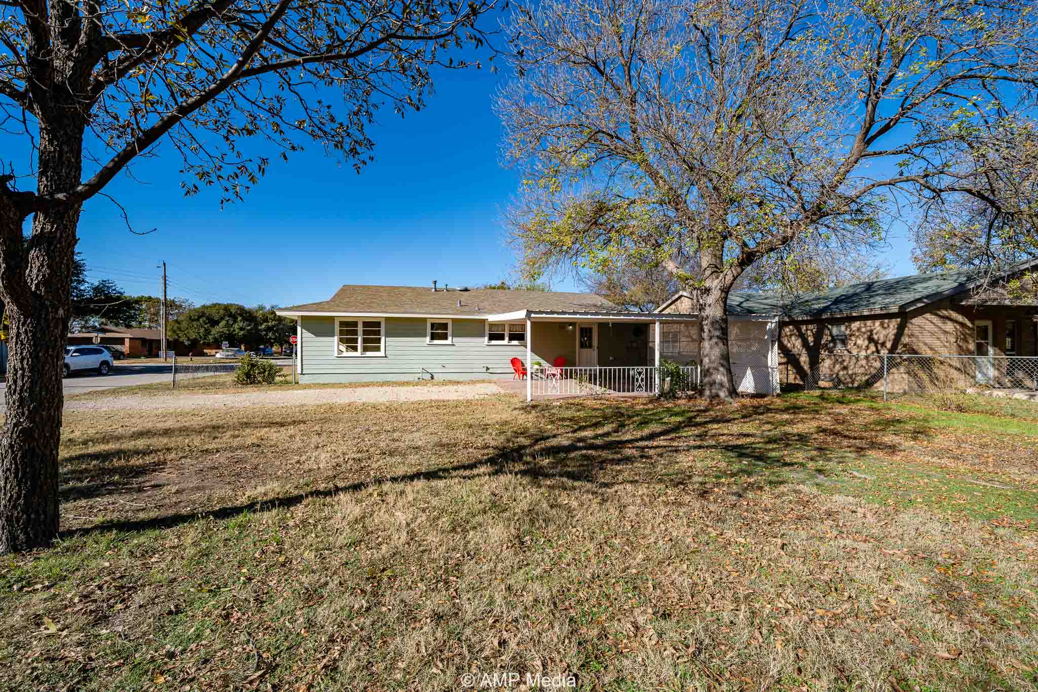 The backyard features a chain-link fence, a double-carport with a covered patio ideal for outdoor living, a large backyard perfect for family cookouts, and a storage shed. This remodel won’t last long!