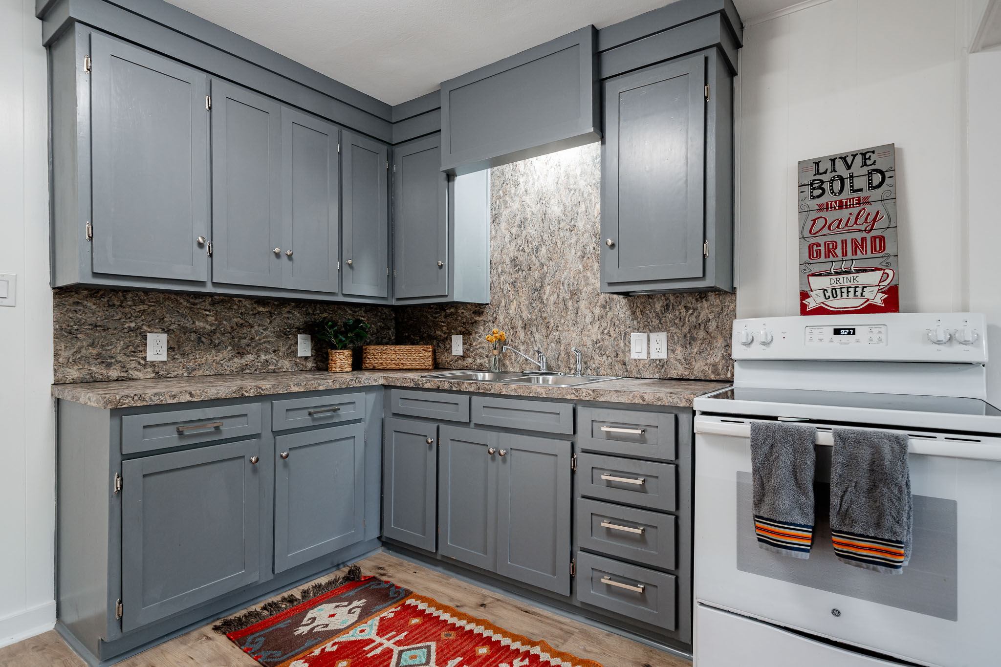 The kitchen has been updated and features an eat-in design with lots of natural light, new countertops, new hardware, and a new sink and faucet, making it perfect for family meals and gatherings.