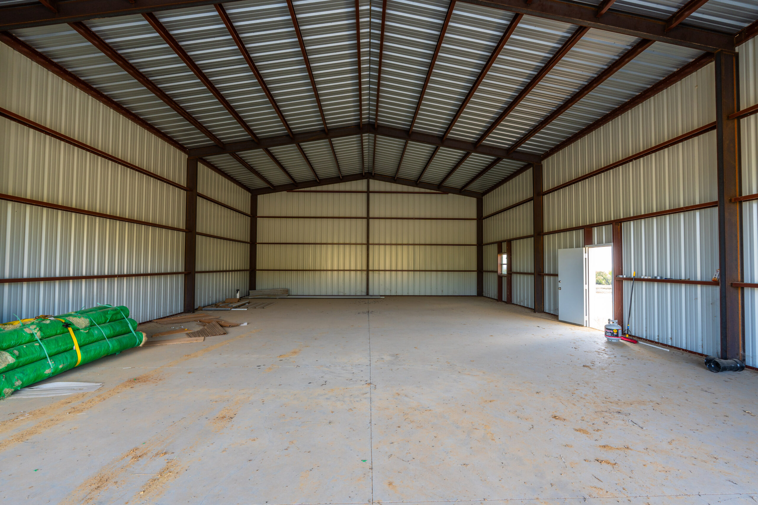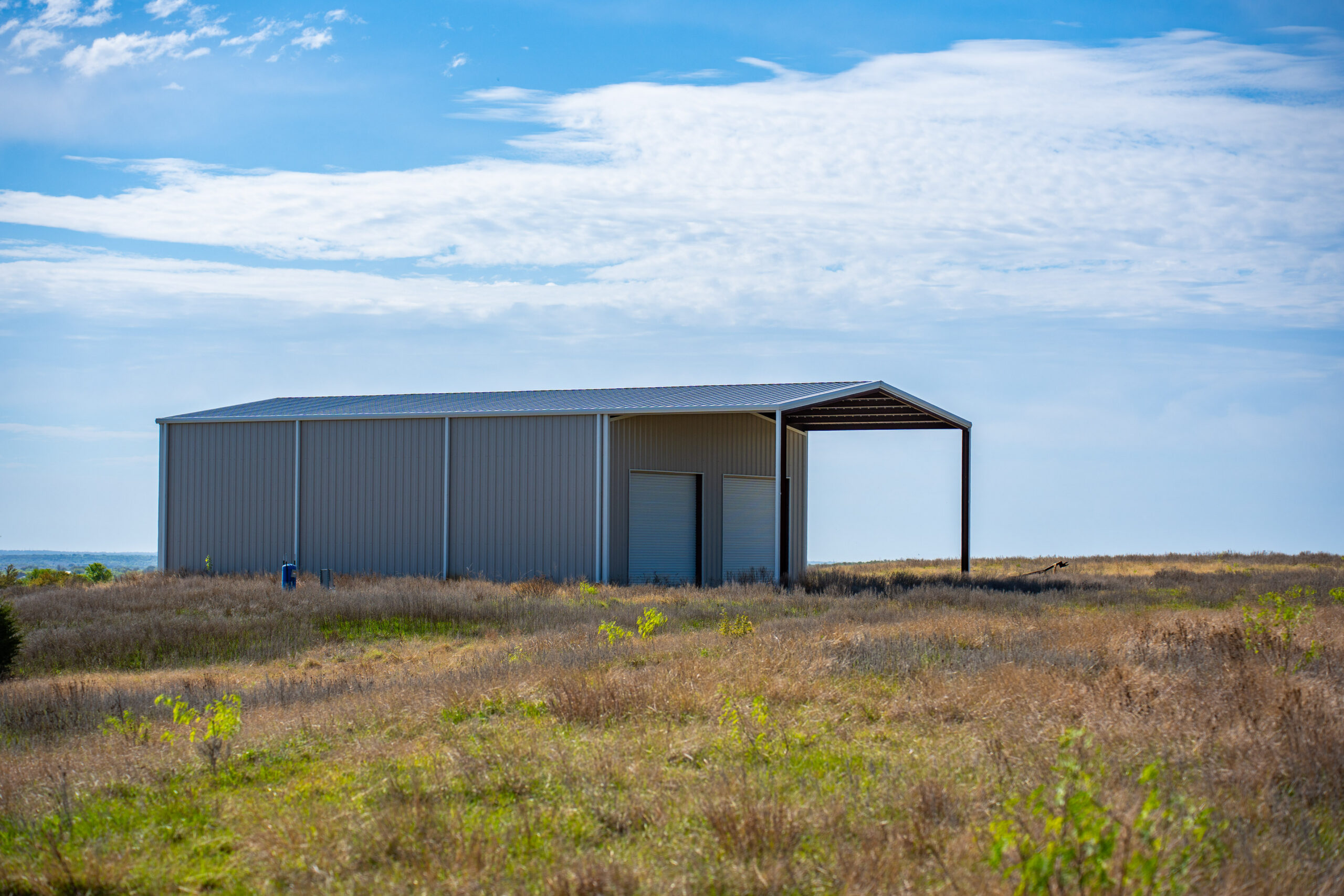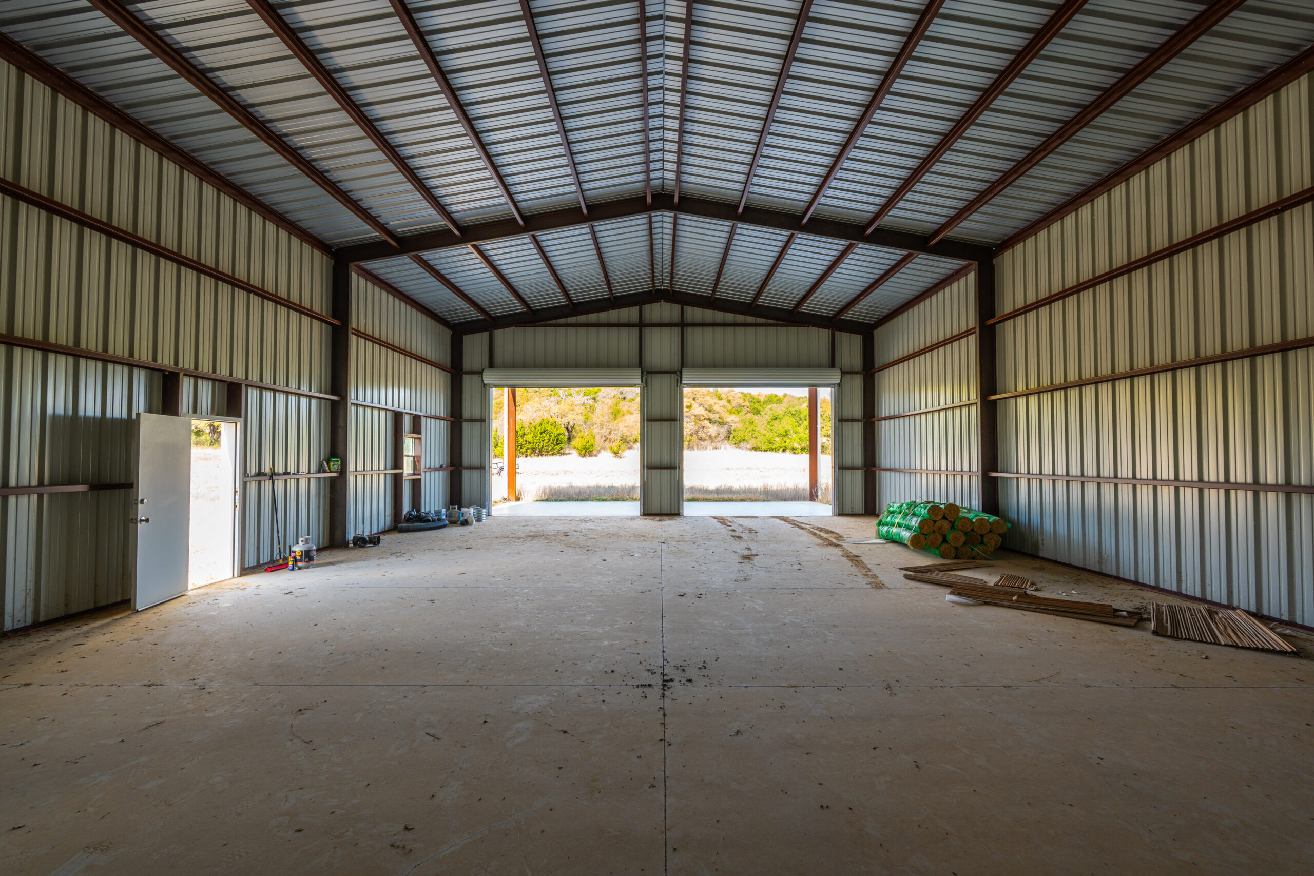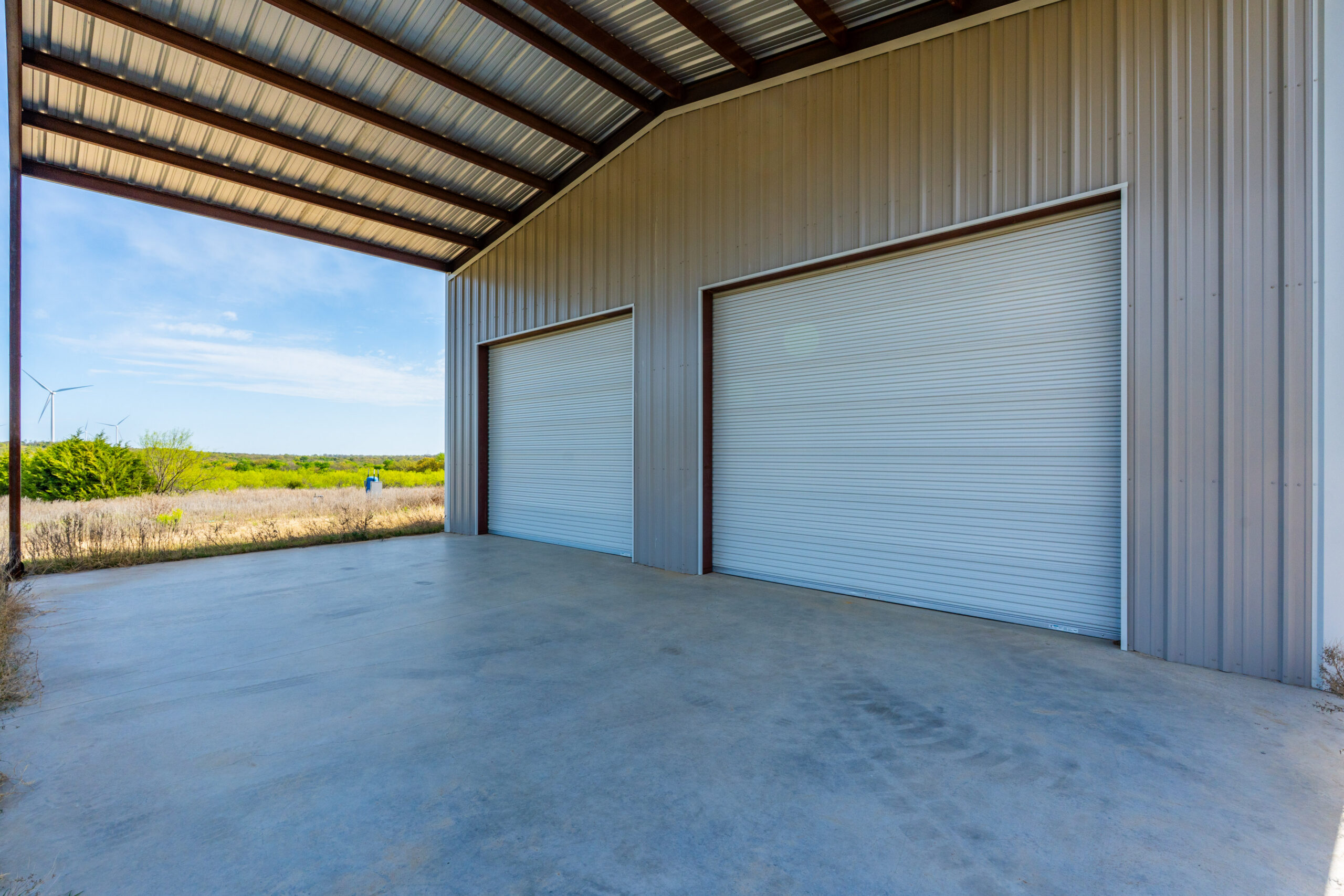 New Metal Barn with concrete floor, 2 large rollup doors and large parking pad under lean-to