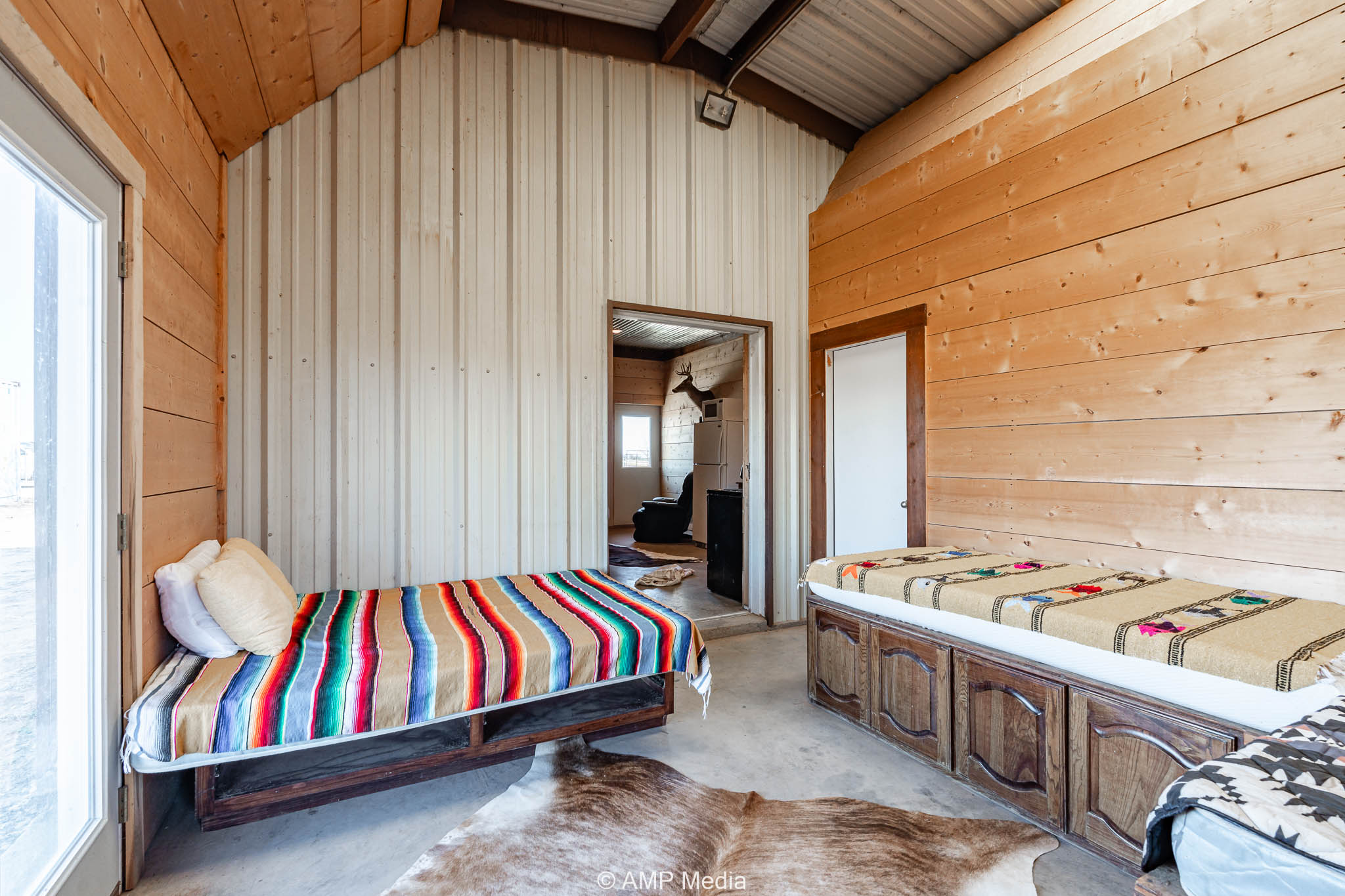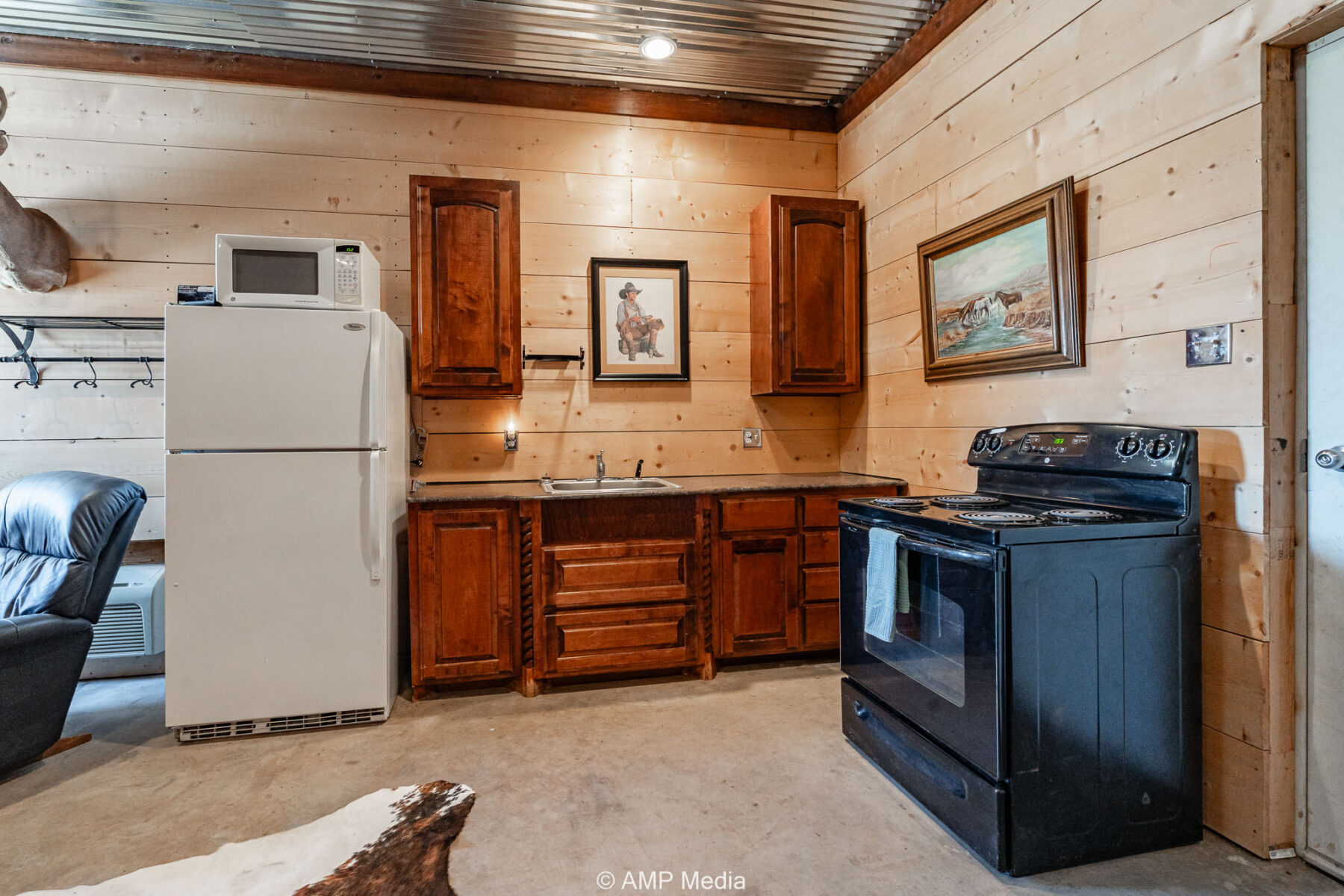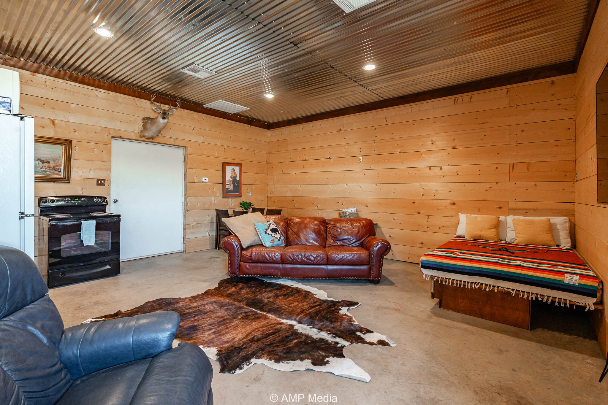 A well-appointed hunter’s cabin offers a comfortable base camp for weekend getaways or extended stays, complete with a fully equipped kitchen, bathroom, ample storage, and central heating and cooling.