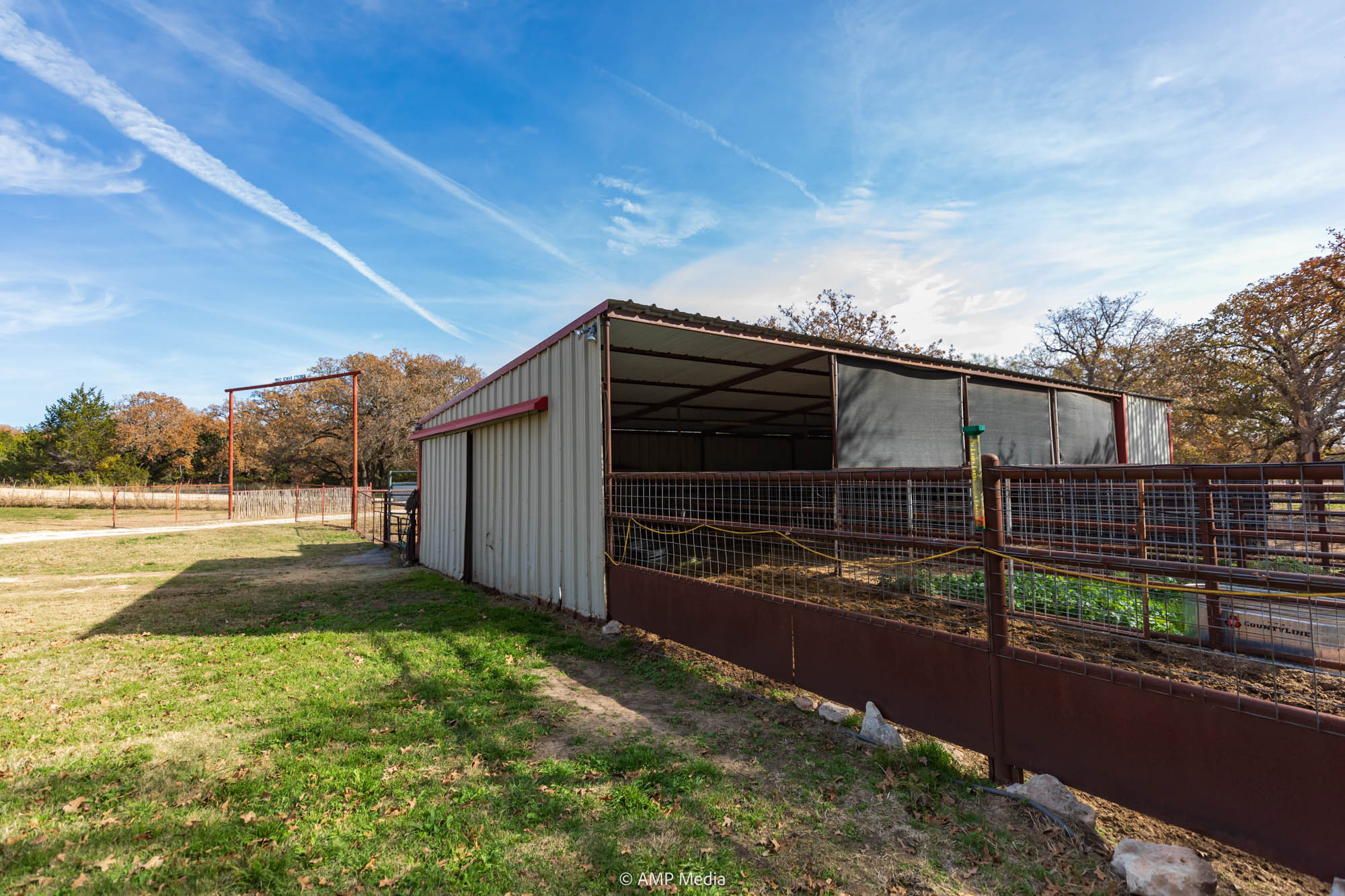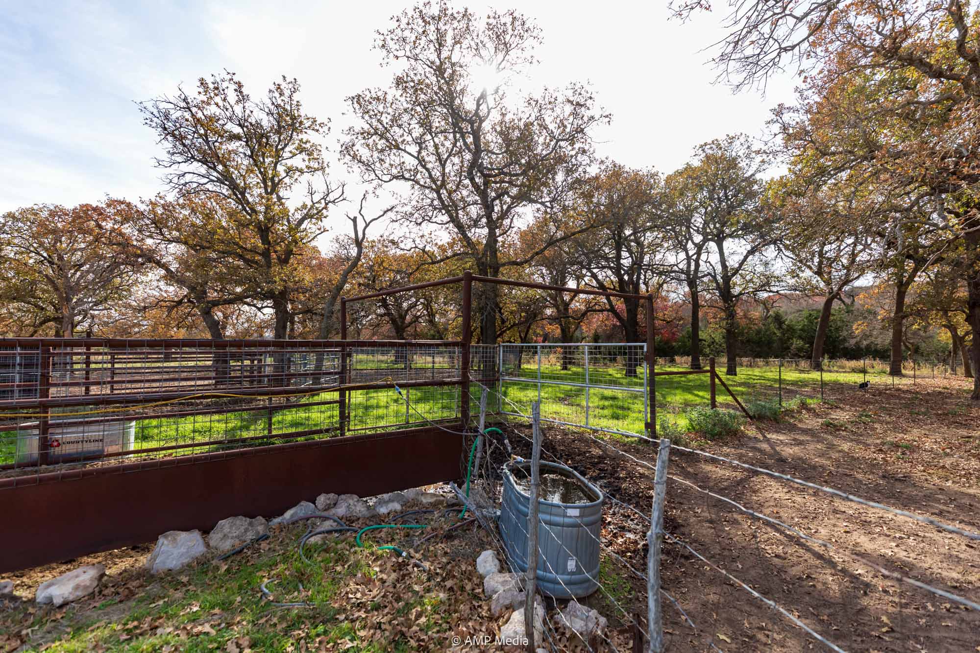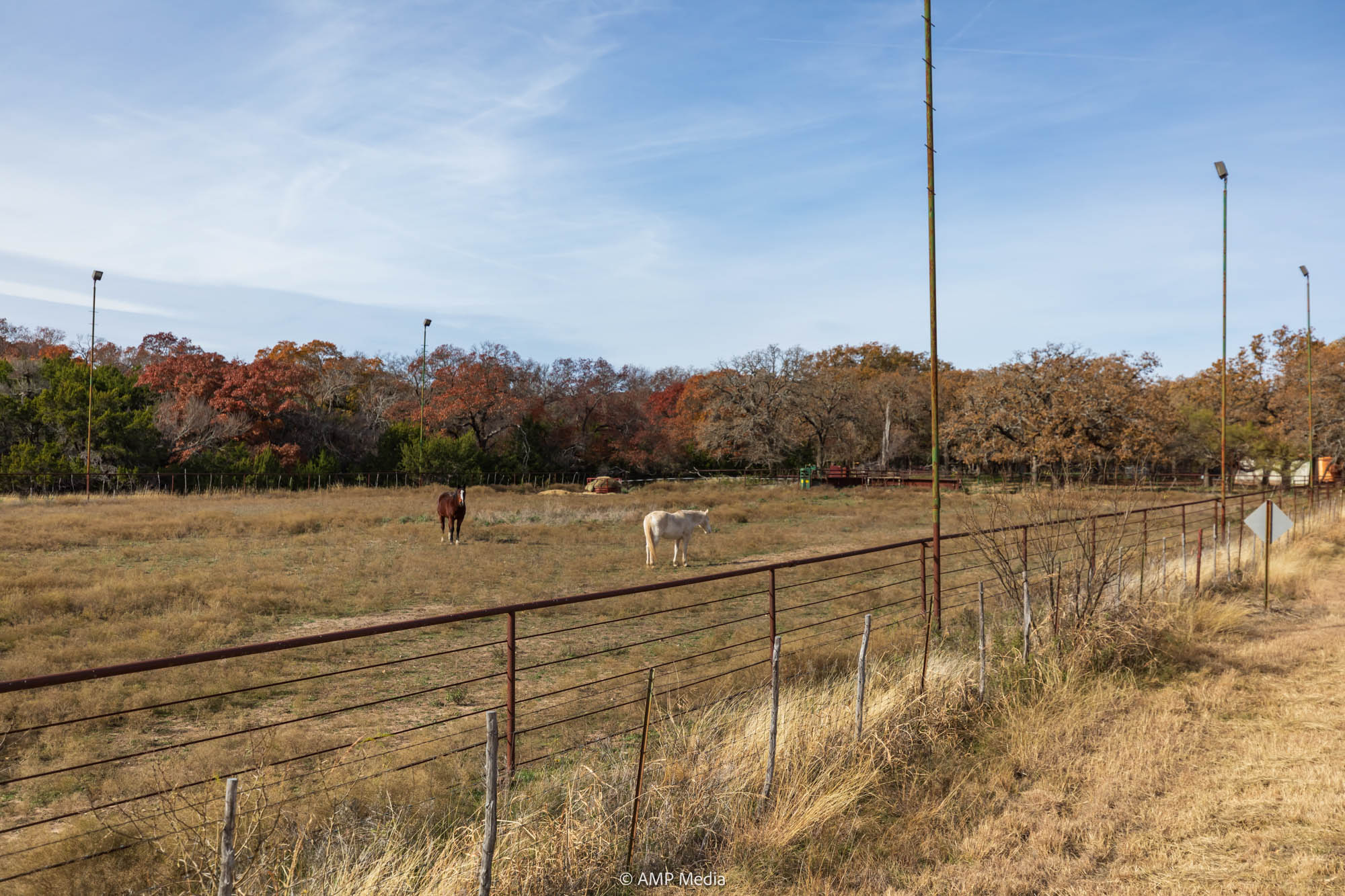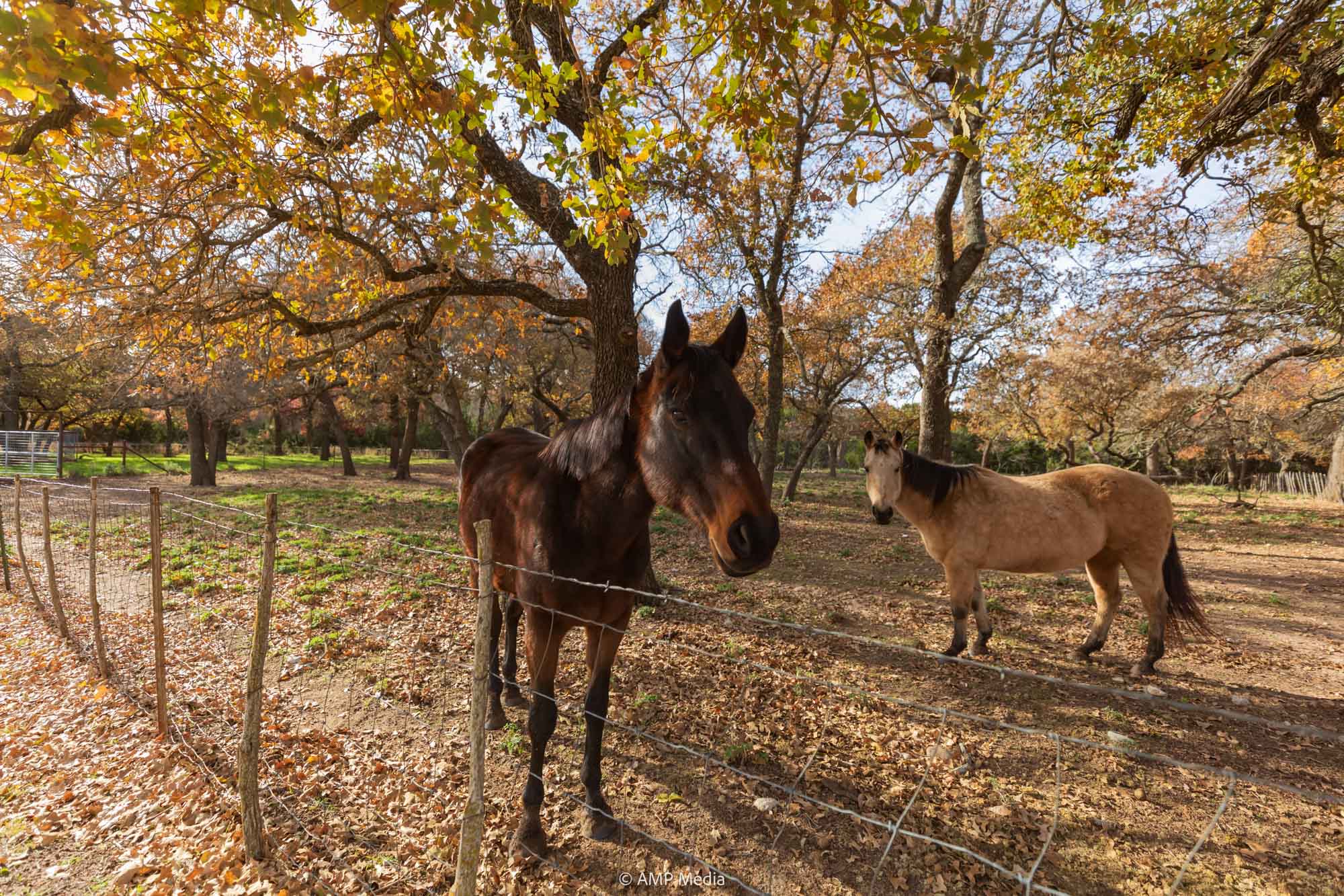A charming three-bedroom, two-and-a-half-bath home is ideally positioned to overlook the oaks and a serene pond. The property also features a barn with horse stalls and a lighted roping arena, making it perfect for equestrian use.