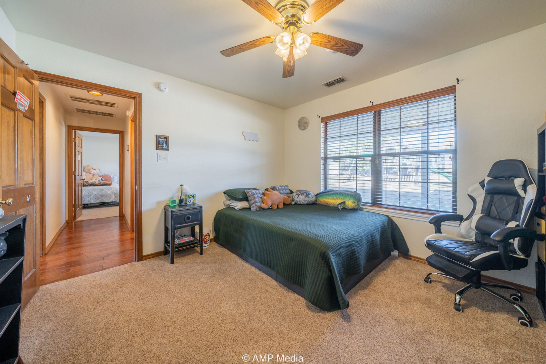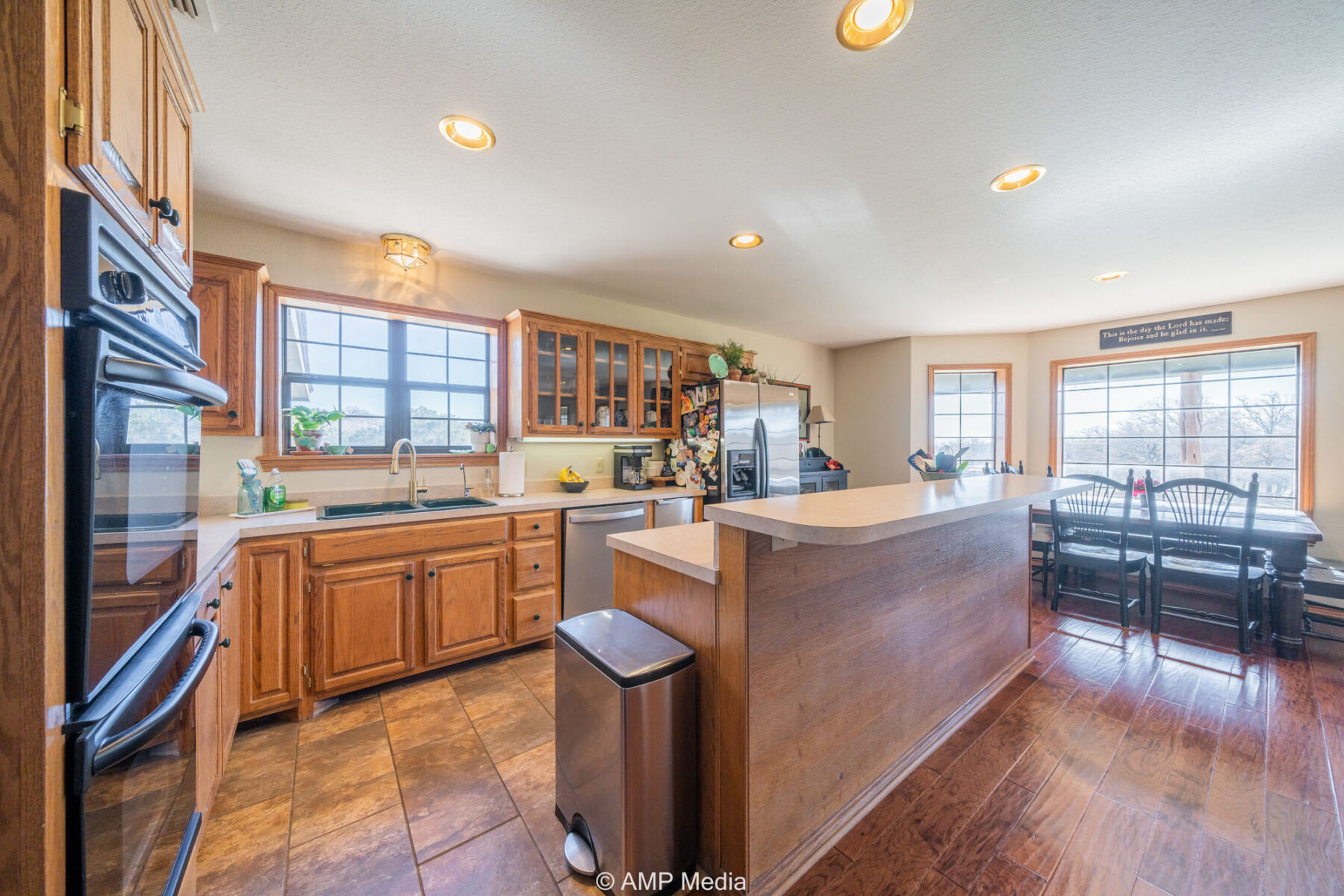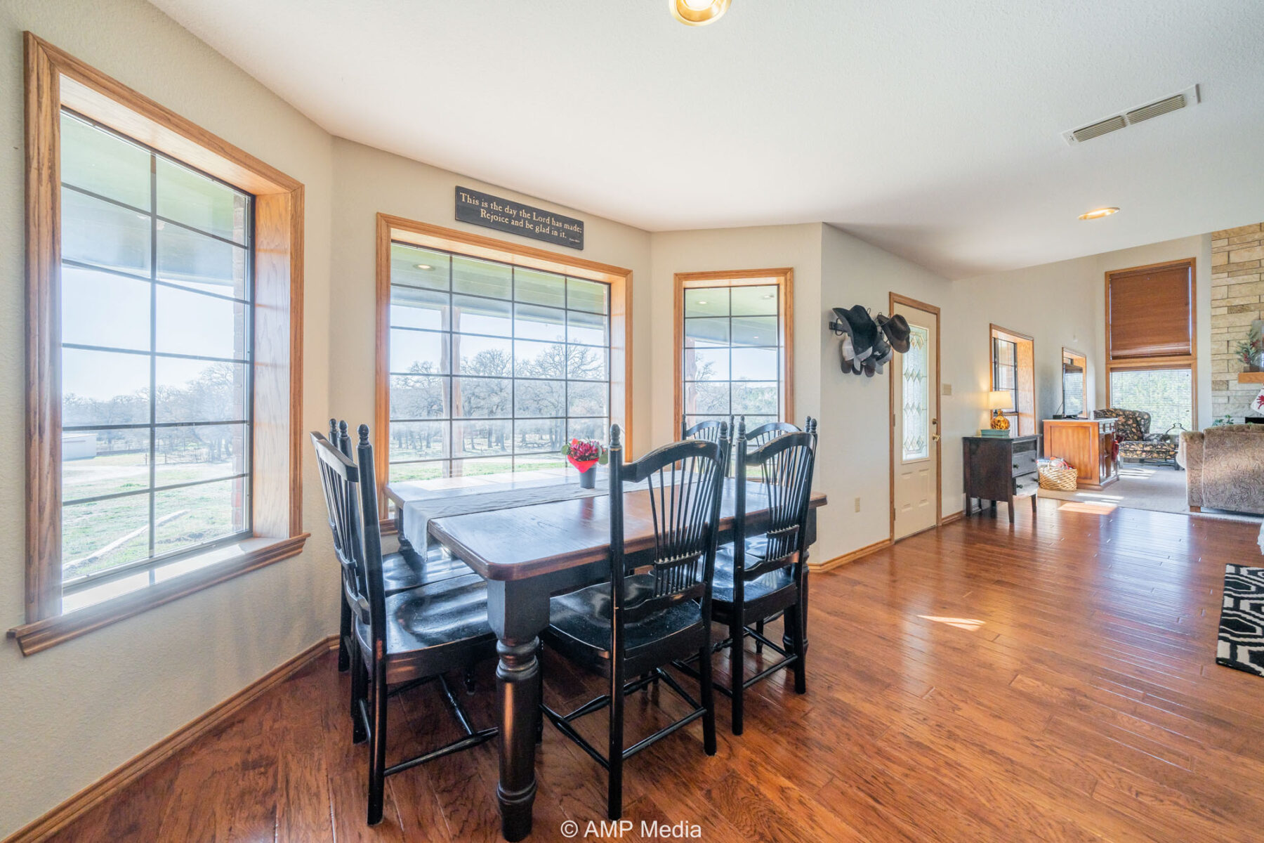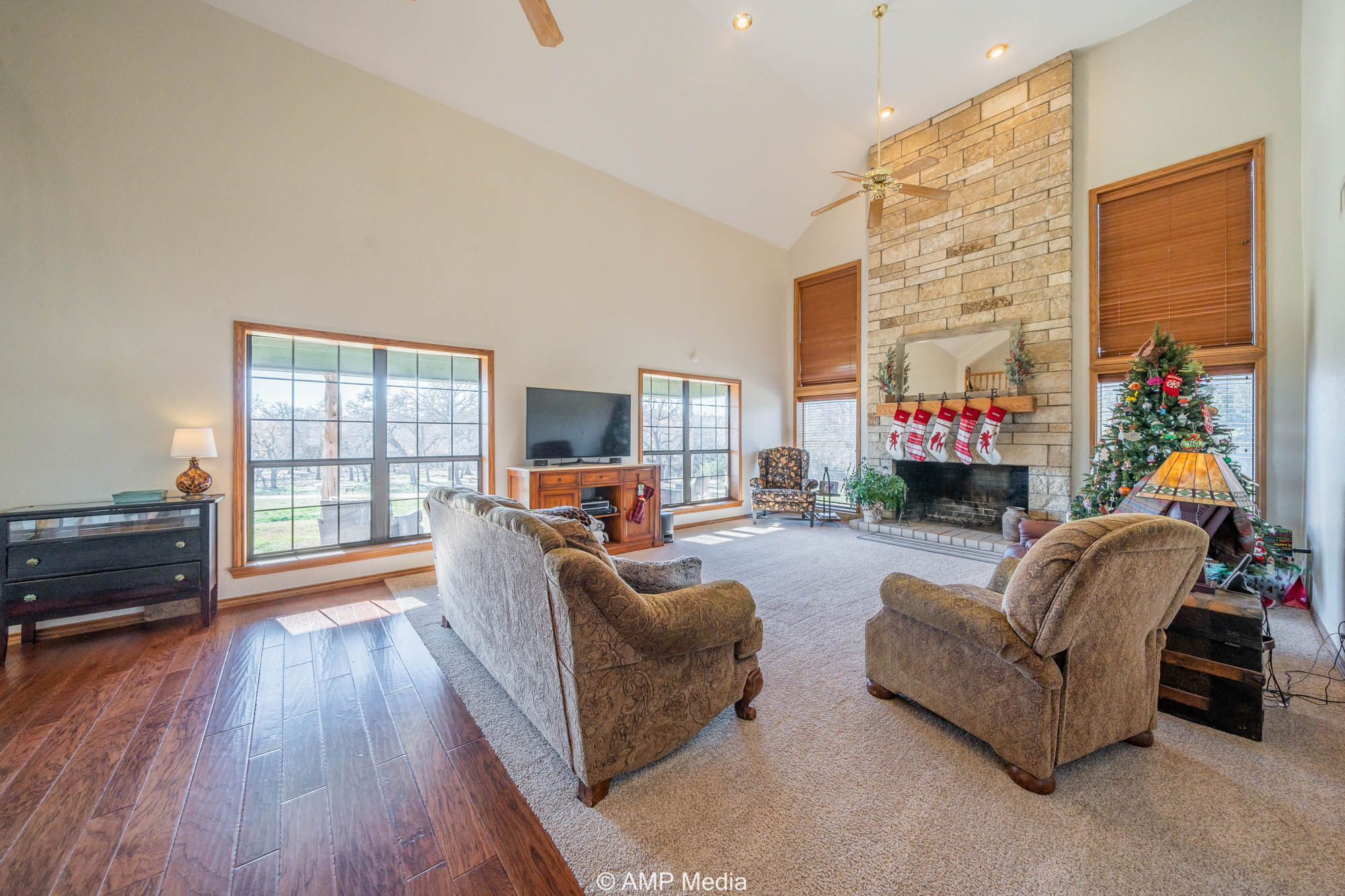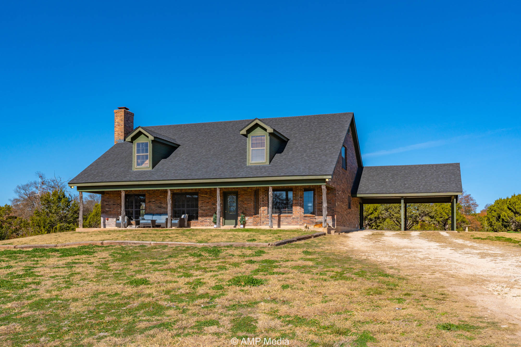 A charming three-bedroom, two-and-a-half-bath home is ideally positioned to overlook the oaks and a serene pond. The property also features a barn with horse stalls and a lighted roping arena, making it perfect for equestrian use.