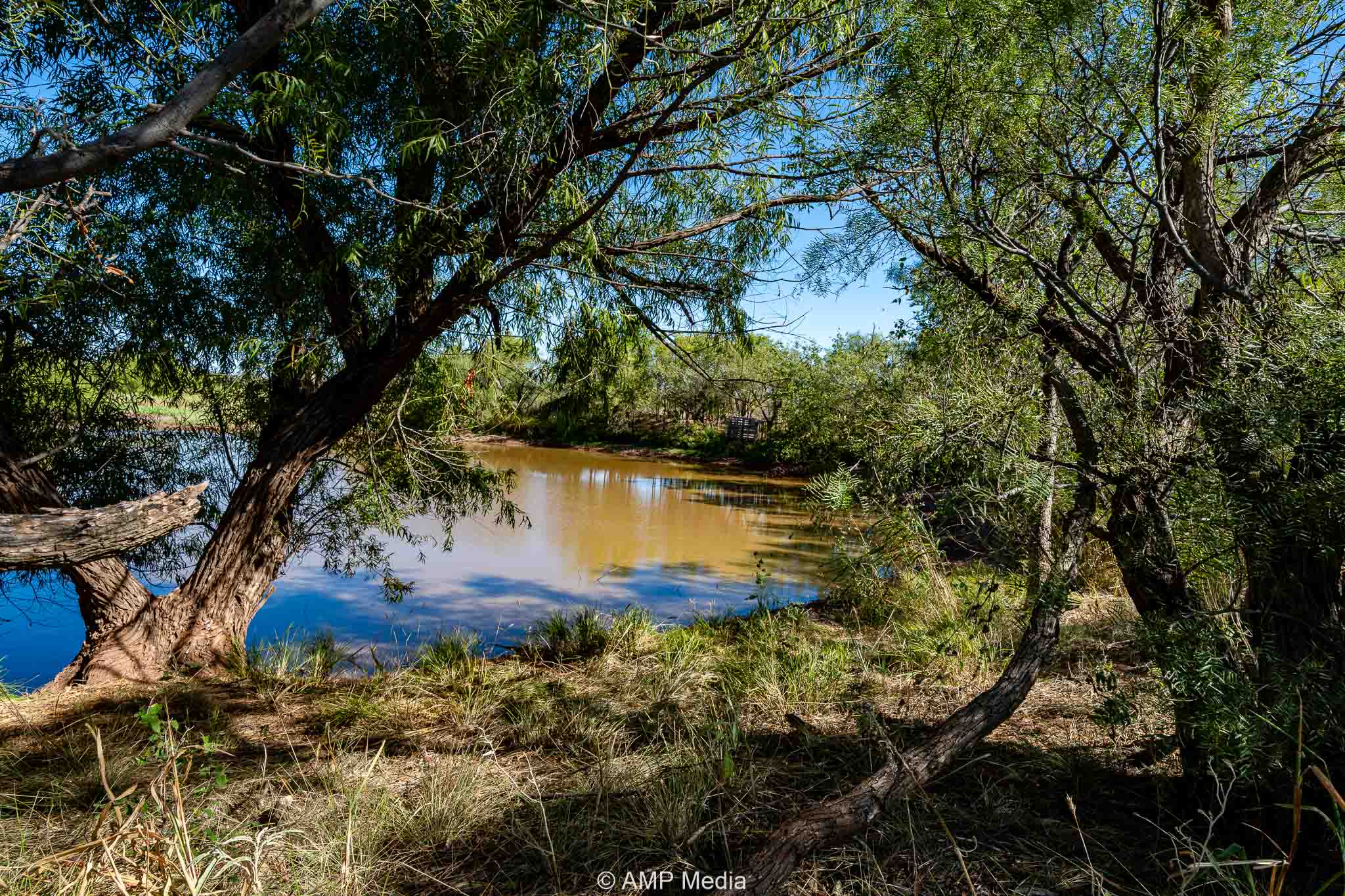 An impressive stock tank sits near the creek-perfect for fishing or relaxing by the water.